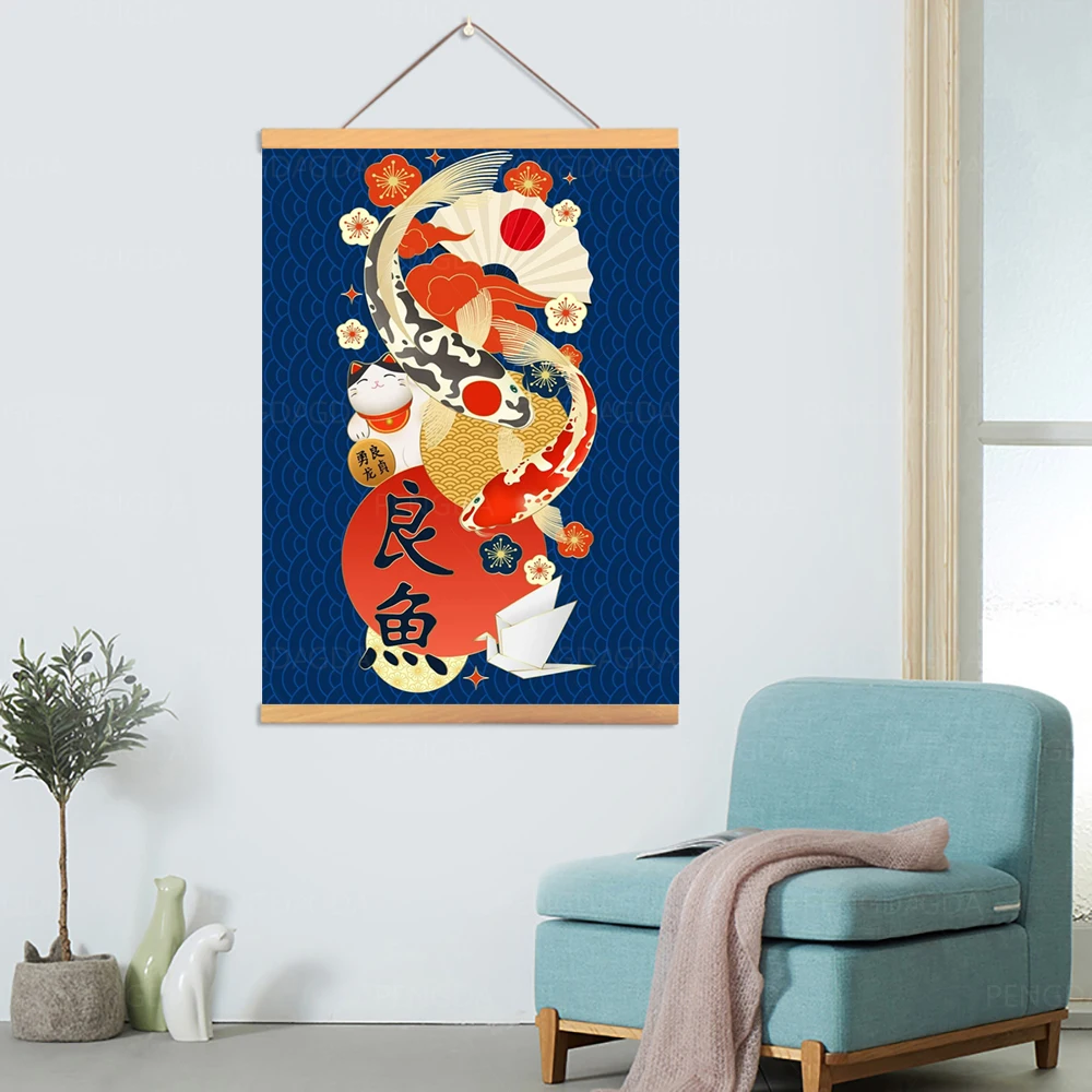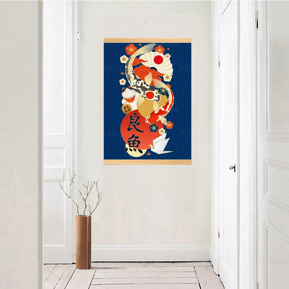 Картина на холсте, настенное искусство, постер с изображением ин Ян кои, домашний японский декор, разноцветные Висячие свитки из массива дерева для гостиной