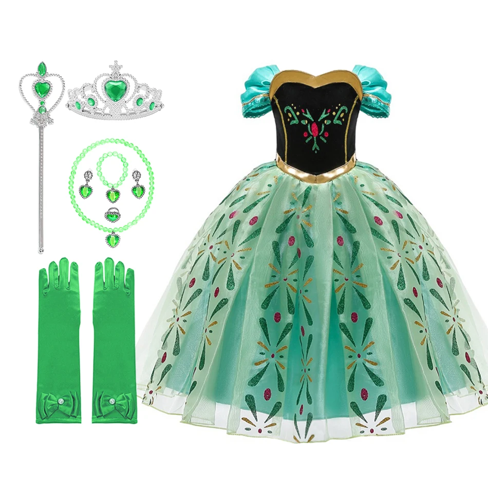 Платье принцессы для девочек, Детский карнавальный костюм Анны, Снежная королева, зеленое празднивечерние платье для дня рождения, одежда для девочек