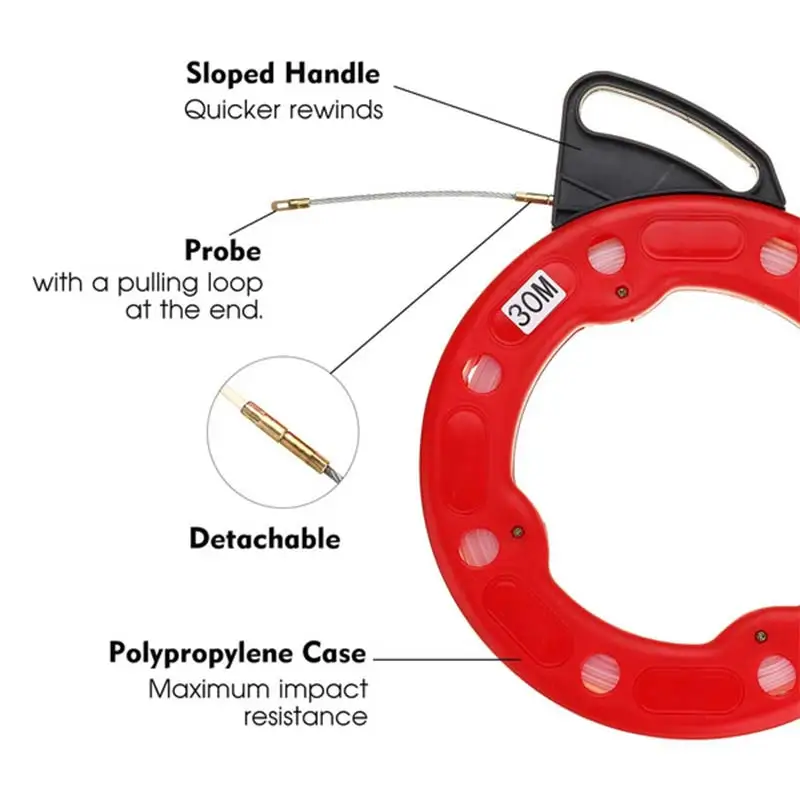 1,30 М гибкий источник: http:/стальной для протяжки проводов с ударопрочный пластиковый чехол имеет прочная и удобная ручка для удобной переноски. Ручка поставляется со встроенным замком большого пальца для вытягивания электрических или коммуникационных проводов. Рычаг ручки помогает свернуть кабель обратно. Лента с тянущей петлей в конце.