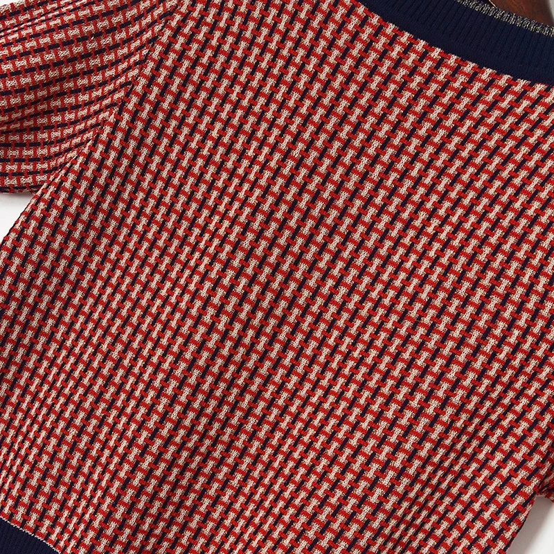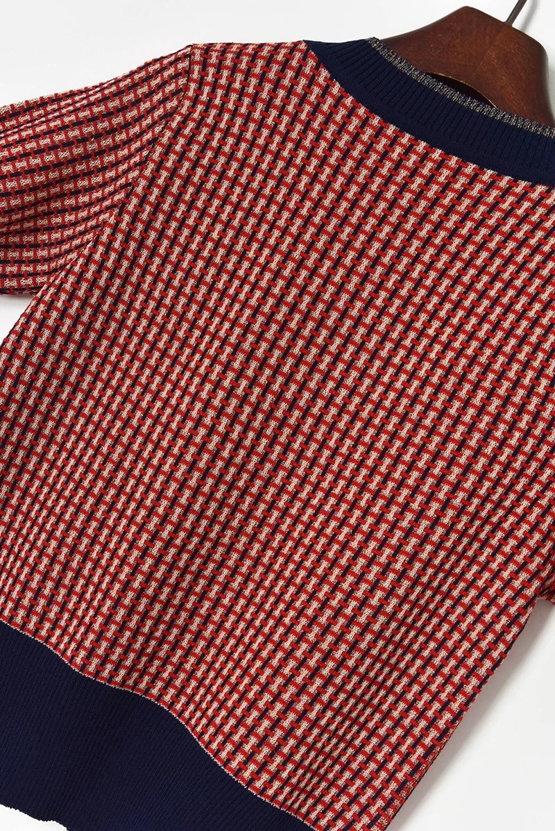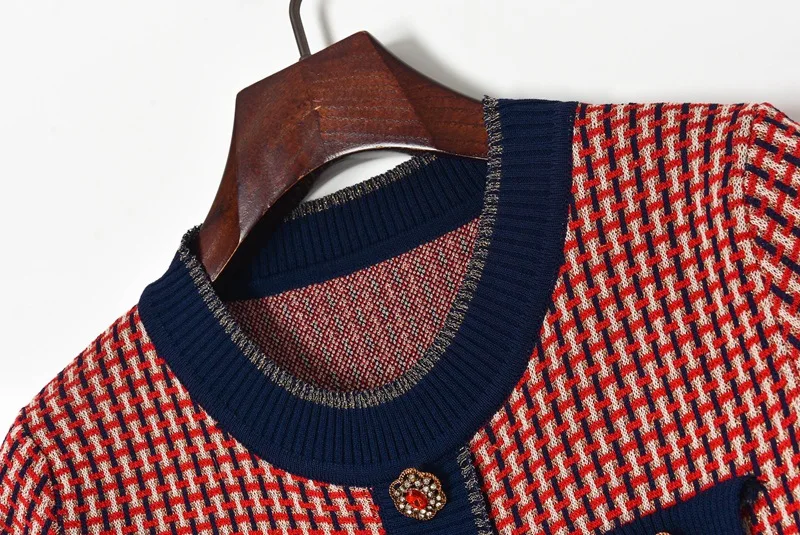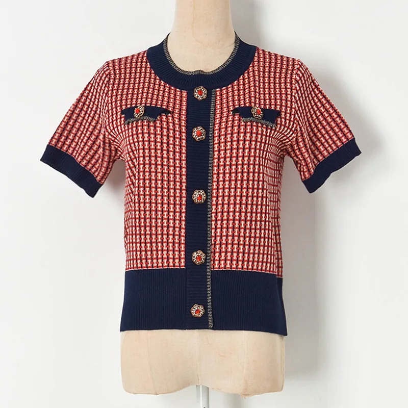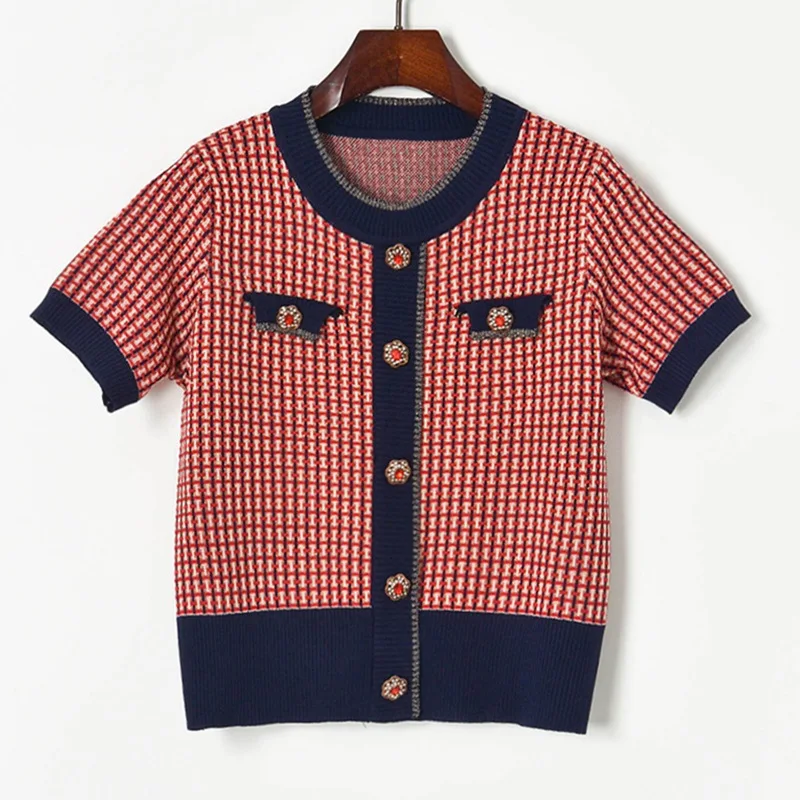 Короткий жакет с круглым вырезом, Женский вязаный Топ в полоску, с пуговицами со стразами, кардиган с коротким рукавом, Свободный кардиган в красную клетку, новинка 2021