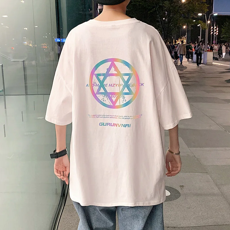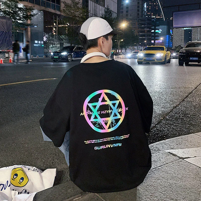 Светоотражающая футболка 2021, уличная свободная модная футболка в стиле Харадзюку, корейские мужские и женские черные футболки большого размера в стиле панк для мальчиков