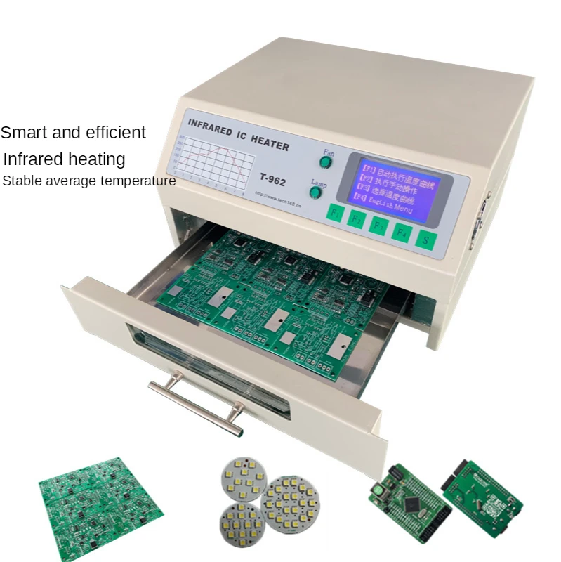 Модель: T-962Напряжение: 110 В/220 ВПоверхность для извлечения материала/мм: 180*235Номинальная мощность: 800 ВтСпособ нагрева: инфракрасное ОтоплениеЦикл процесса: 1-8 минРежим управления: восемь интеллектуальных регуляторов температурыДиапазон настройки температуры: 0-280 ℃Подробное описание:1. Инфракрасный IC обогреватель T962 является микропроцессором, контролируемым оплавлением. Он используется для эффективной пайки различных SMD и BGA компонентов. Весь процесс пайки может быть завершен автоматически, и он очень прост в использовании. В этой машине используется Мощный Инфракрасный поток горячего воздуха, поэтому температура остается очень точной и равномерно распределена.2. Оконный ящик предназначен для удержания рабочей части и обеспечивает безопасные методы пайки и манипулирование SMD/сумкой и другими маленькими электронными частями, установленными на сборке PCB. T962 может быть использован для автоматической переработы припоя для исправления плохих стыков припоя, удаления/замены плохих компонентов и завершения небольших инженерных моделей или прототипов.