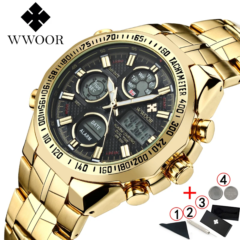 Часы наручные WWOOR Мужские Цифровые, светодиодные, золотистые брендовые Роскошные водонепроницаемые из нержавеющей стали, 2021
