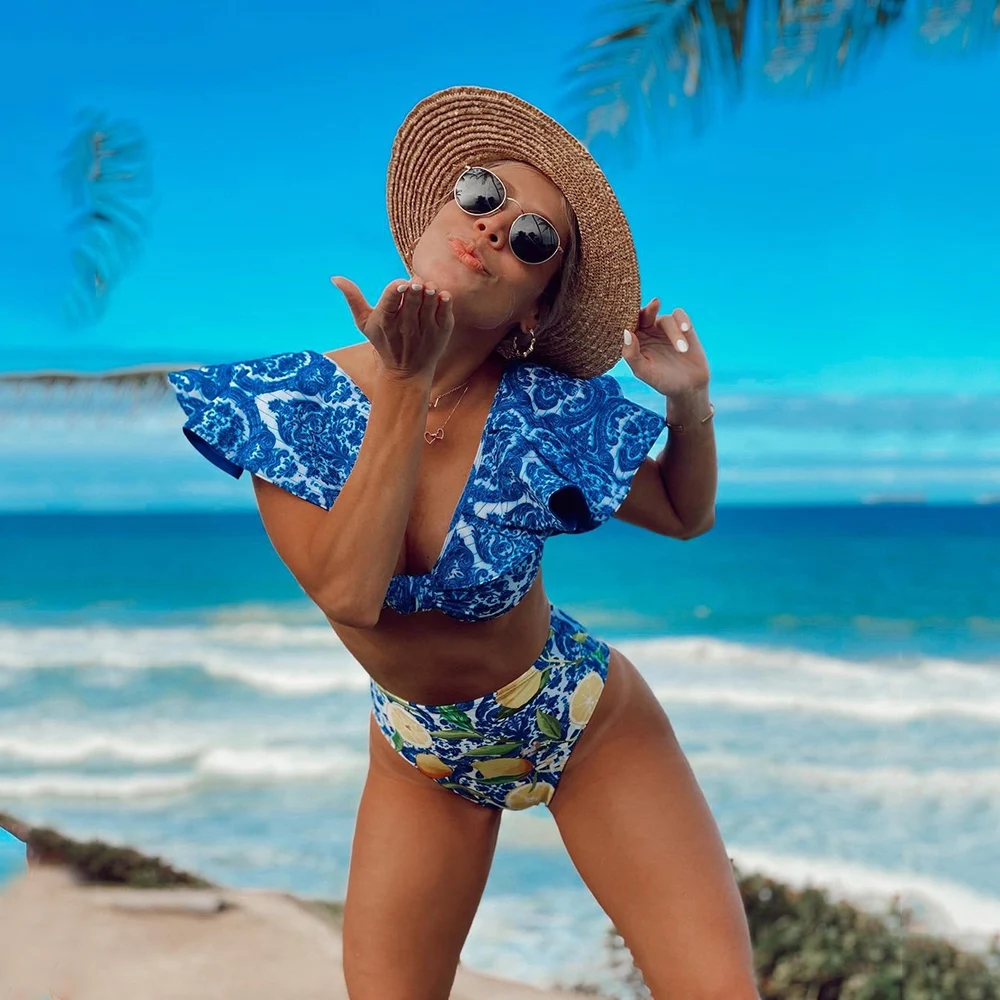 Женский купальник с оборками, сине-белый бикини в стиле Фарфор купальник с высокой талией, пляжная одежда, 2021