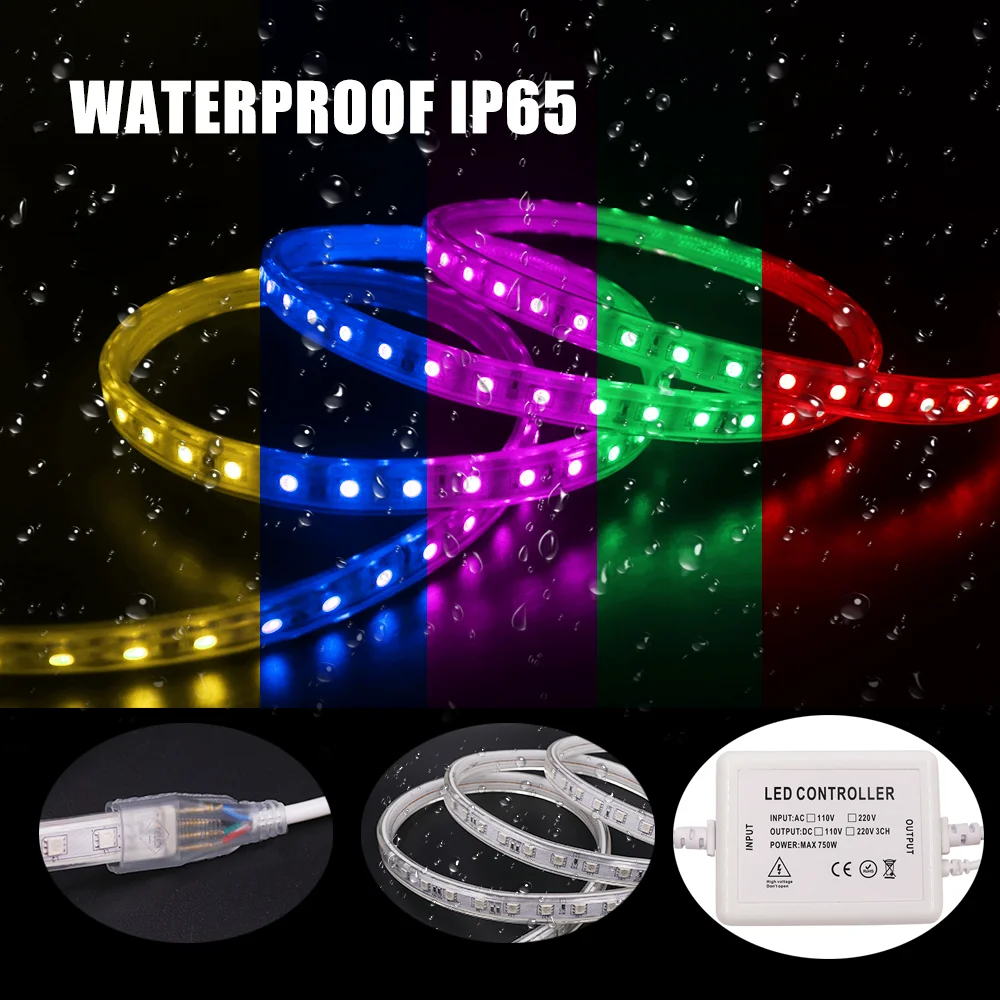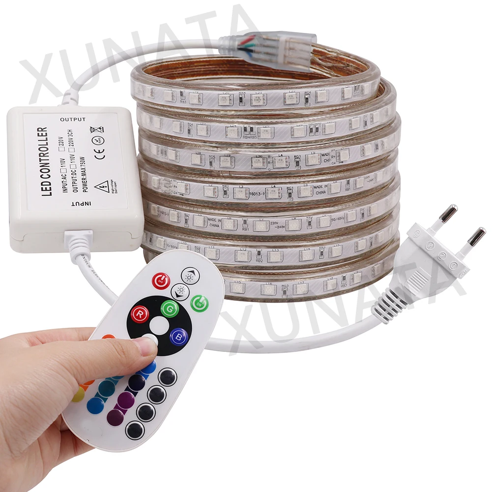 Светодиодная лента RGB, 5050, 60 светодиодовм, гибкая лента, диод, наружное освещение, 220 В переменного тока, водонепроницаемая светодиодная лента с пультом дистанционного управления