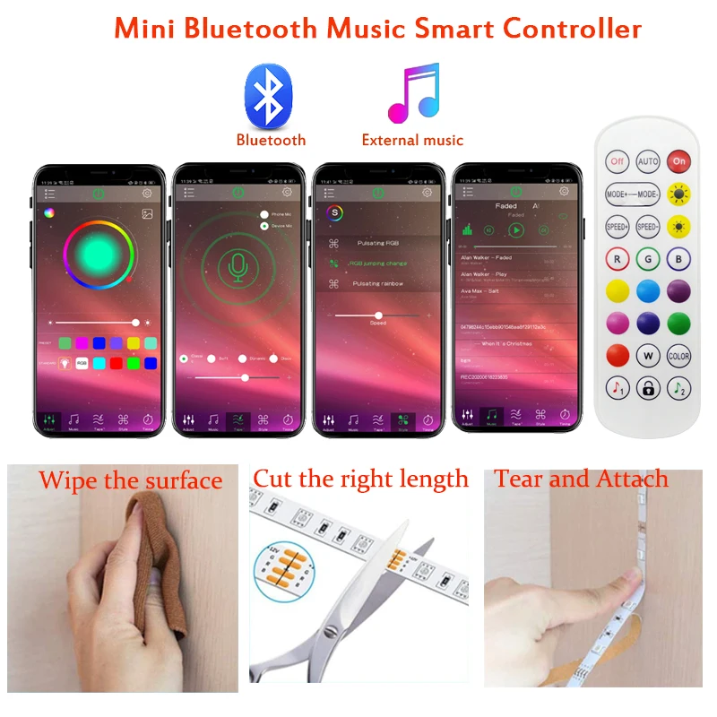 О контроллере Blueooth/Music wifi1. Комплект управления с помощью приложения, управление светодиодными полосами через приложение, 24-клавишный пульт дистанционного управления и контроллер управления, полосы света имеют режим смарт-музыки, цвет света изменится с ритмом звука и музыки. Создайте романтическую, великолепную, интересную, волшебную атмосферу для ваших Вечерние