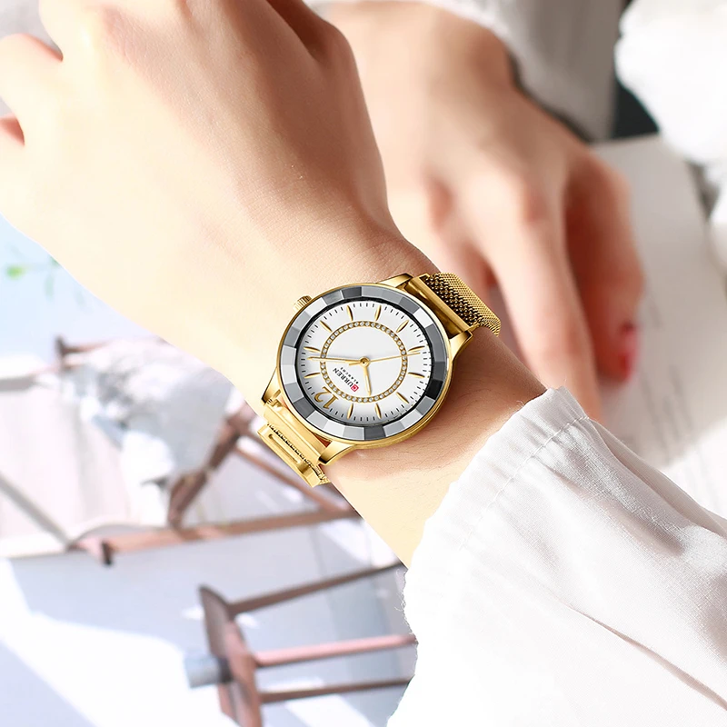 Часы Curren женские наручные, брендовые элегантные модные золотистые, из нержавеющей стали, 2021