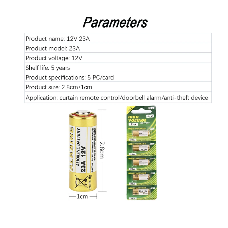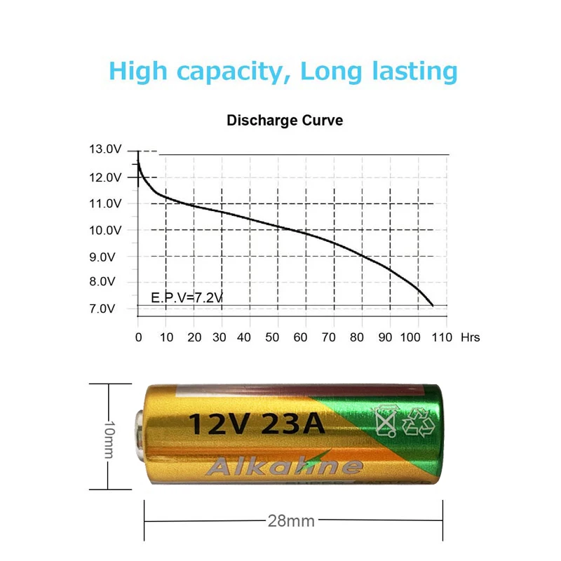 Модель: 12V 23A щелочной БатареяТип батареи: аккумуляторные батареи 12V 23A 23AE сухие щелочные батарейки основной батареиБренд: NXМодель: 12V 23A щелочной БатареяРазмер: 12 ВНапряжение: 12 ВВысота: 27,5-28,5 ммДиаметр: 9,5-10,5 ммЕмкость: 20 кОм, 24 ч/д, 105 чХимия: щелочной MO2 (не-Hg, не-кадмий)Срок годности: 5 летПрименение: светодиодный светильник, пульт дистанционного управления без ключа, секс-игрушка, лазерная ручка, пульт дистанционного управления, дверной звонок и так далее. Также известный как-23A, 23AE, A23, E23A, V23GA, MN21, LRV08, 8F10R, 8LR23, 8LR932, CA20, K23A, L1028, MS21, RVO8 или VR22