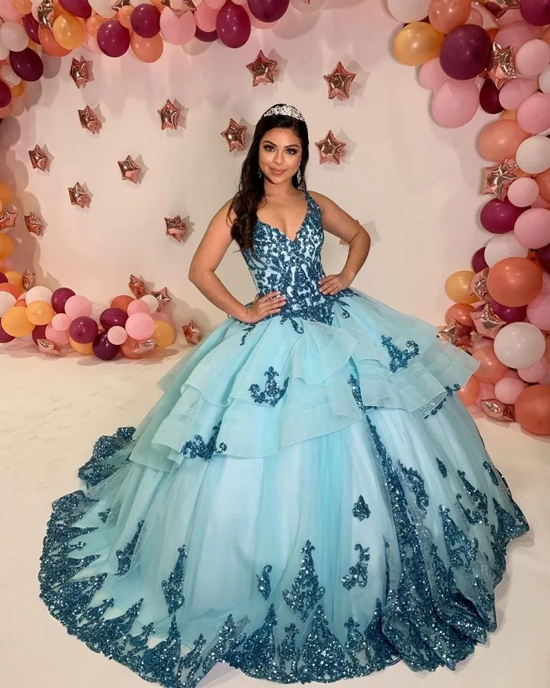 С v-образным вырезом Бальные платья гофрированные манжетки; Аппликации с блестками и бисером, платье принцессы вечерние выпускные сладкий 15 Пышное Бальное Платье без рукавов