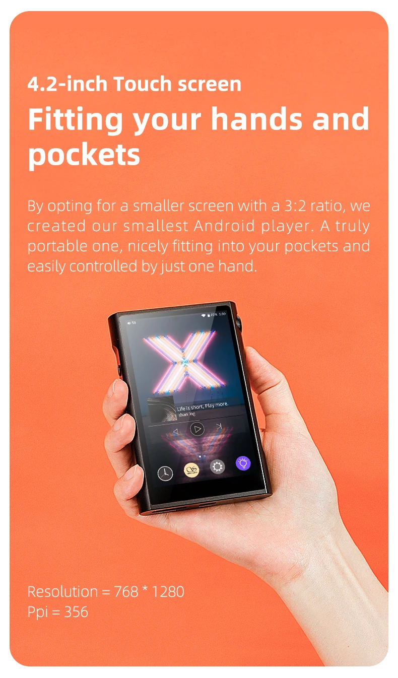 Характеристики:Вес: 168 гРазмеры: 109 мм * 72 мм * 15,9 ммЭкран: Sharp, 4,2 дюймов, 768*1280Система: Откройте Android 7,1Hi-Res: до 32 бит/384 кГц и DSD 256Коэффициент усиления: высокий, низкийПамять: 2 Гб RAM + 32 Гб ROM + слот карты Micro SDАудио чип: ESS ES9219C x 2Емкость аккумулятора: 3200 мАчBattrylife: 23 ч (3,5 мм, с переключением между дальним и DAC), 20 ч (3,5 мм, двойной DAC), 19H (4,4 мм сбалансированный)Поддерживаемые файлы: DSF / DF / ISO / DXD / APE / FLAC/ WAV /AIFF / AIF / DTS/MP3 / WMA,ACC/ OGG/ ALAC /MP2 / M4C / AC3 / M3U/M3U8/OPUS/ Iso (кроме DST)Версия Bluetooth: 4,2Поддержка кодека BluetoothПередатчик: LDAC / LHDC/ aptX HD / aptX /SBCПриемник: LDAC / SBC3,5 мм Выходная мощность:Разделение канала: 75 дБ @ 32 ОмДинамический диапазон: 121 дБШум Пол: >114 дБ (1,8 УФ)Выходная мощностьОдиночный ЦАП: 80 мВт @ 32 ОмДвойной ЦАП: 101 МВт @ 32 Ом4,4 мм балансный выход:Амплитудно-Частотная характеристика: 20 Гц-40 кГц (-0,5 дБ)Разделение канала: 115 дБ @ 32 ОмДинамический диапазон: 121 дБШум Пол: >112 дБ (2,4 УФ)Выходная мощность: 240 МВт @ 32 Ом