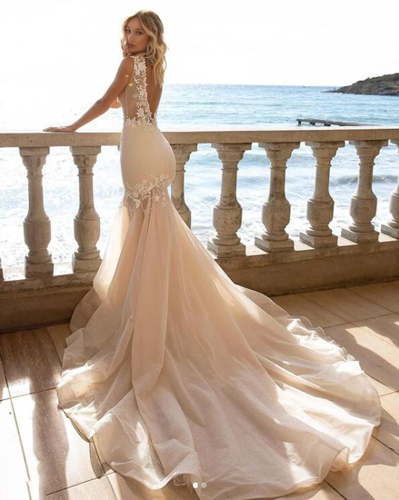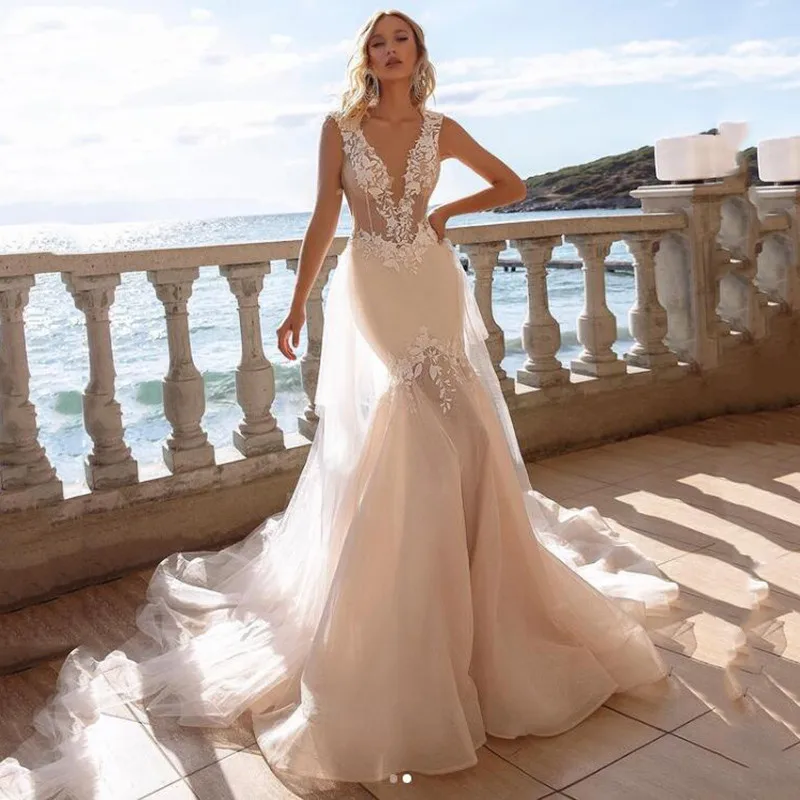Сексуальные свадебные платья Русалочки с глубоким v-образным вырезом без рукавов с кружевной аппликацией, свадебные платья для пляжа со шлейфом, Турция, Robe De Soriee 2021