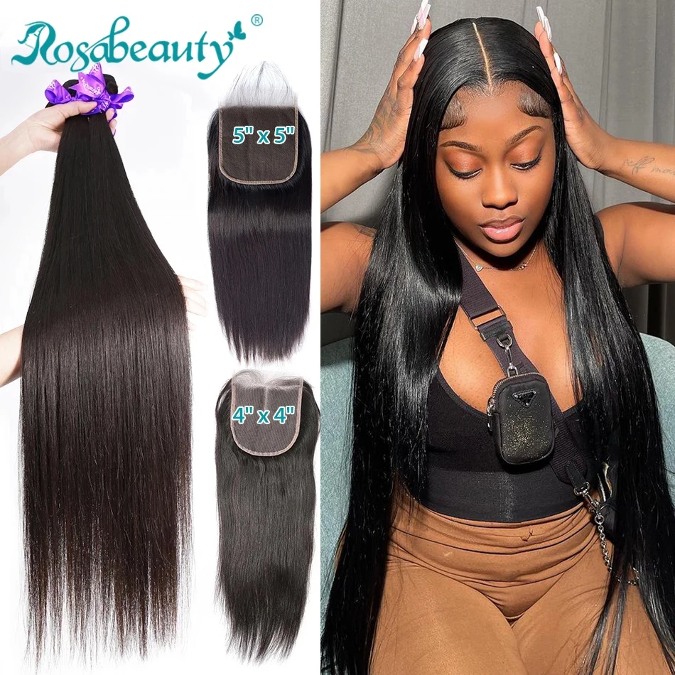 Rosabeauty 5x5 HD прозрачные прямые 3 4 пряди с закрытием 30 дюймовые перуанские волосы человеческие волосы для наращивания волна и 4X4 фронтальная
