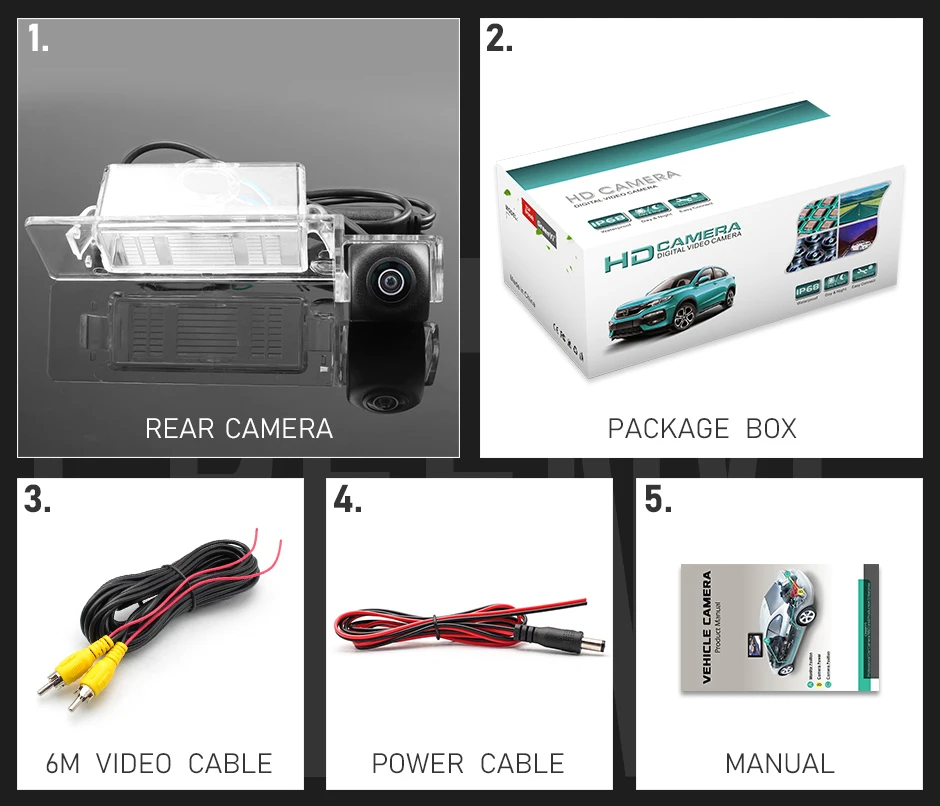 1. Задняя камера2. Коробка для посылка3. Видео кабель (6 м)4. Кабель питания5. Руководство пользователя