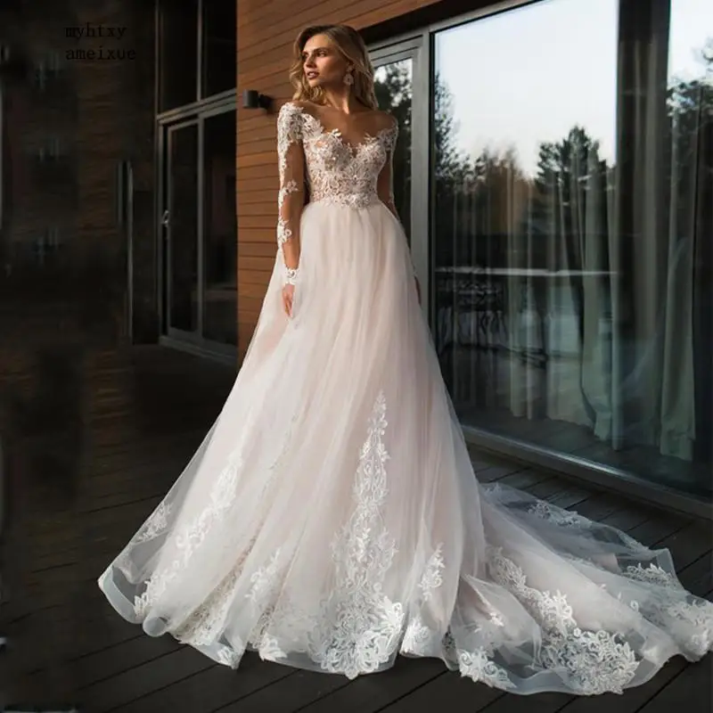 Элегантное кружевное свадебное платье с аппликацией свадебное платье Vestido De Noiva 2020 с открытой спиной с длинными рукавами ТРАПЕЦИЕВИДНОЕ вечернее платье с шлейфом Свадебные платья с v-образным вырезом