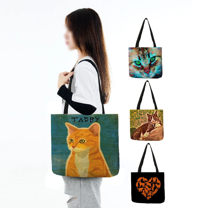 Сумка-тоут женская, из льна, с принтом в виде кошки