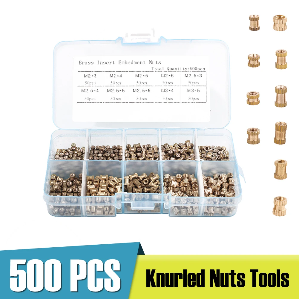 500 шт набор M2 M2.5 M3 гайка с кольцевой вставкой из латуни литье под давлением накатанная Резьбовая формовка из латуни, с накатанной резьбой вставки гайки инструменты коробка
