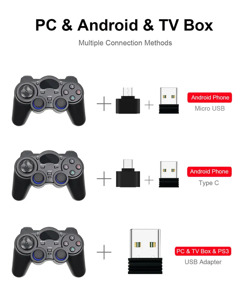 Этот контроллер 2,4g совместим с многоплатформенными играми. Это используется для Android смартфонов/планшетов/ТВ-боксов/для PS3/ноутбуков/ПК. Примечание: Пожалуйста, убедитесь, что ваш телефон имеет функцию OTG