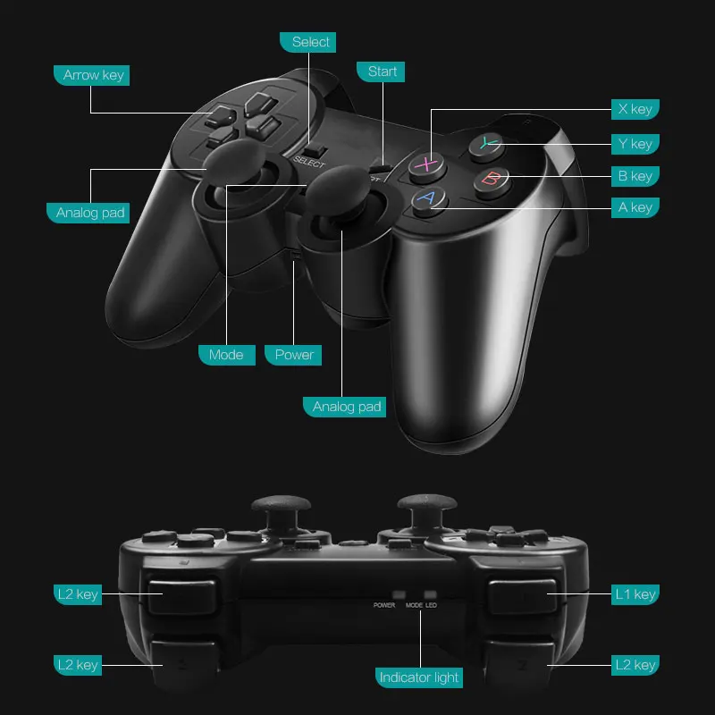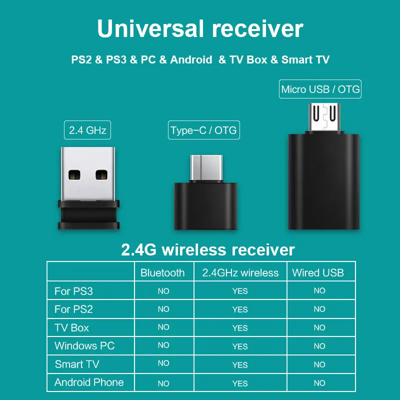 Этот игровой контроллер не имеет функции Bluetooth и вибрации, с использованием развитой технологии беспроводной передачи 2,4G! Превосходное автоматическое подключение. Использование высокопроизводительных чипов, геймпад в игре имеет лучшую стабильность, высокоточные рычаги на 360 °, задержка почти нулевая, поддержка всех видов устройств android. Поддержка ПК, планшета, ТВ-приставки, smart TV, PS3 и т. д. Благодаря дизайну с изгибом человеческого тела вы не будете чувствовать усталость, даже если вы долгое время привыкли к игре!