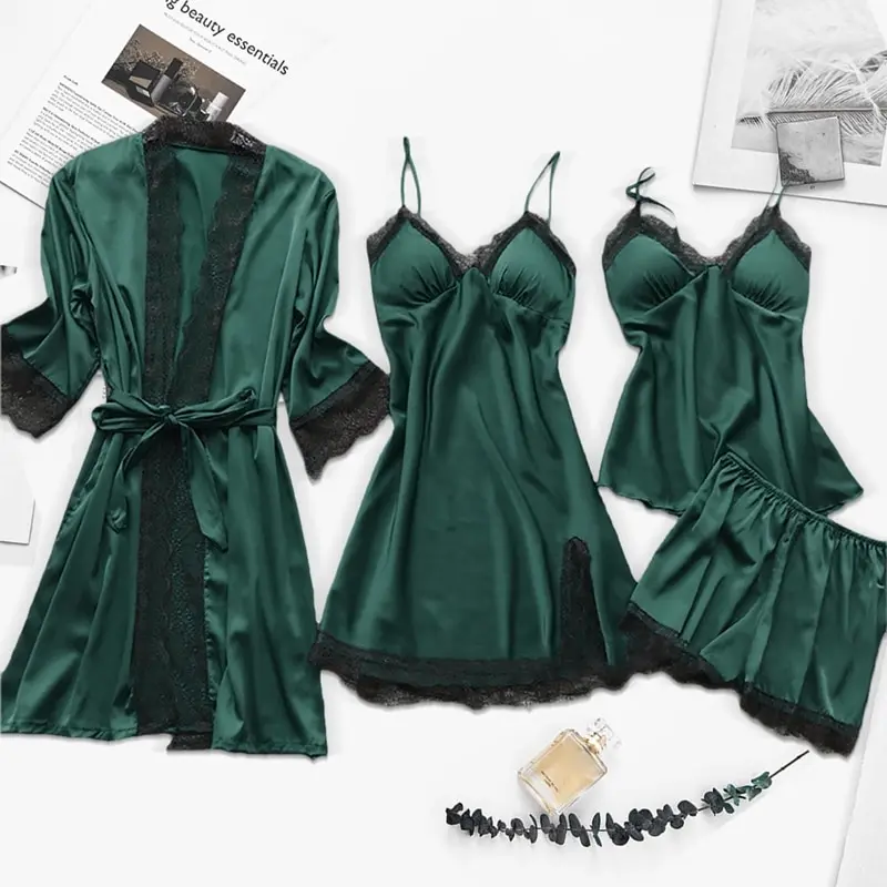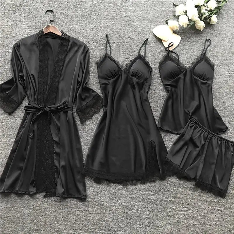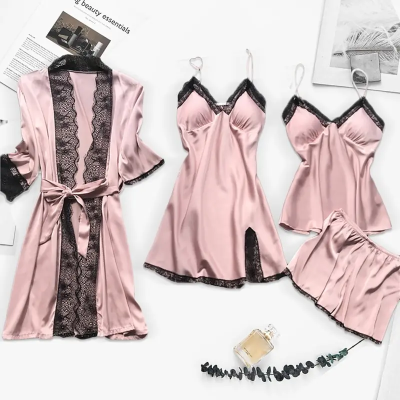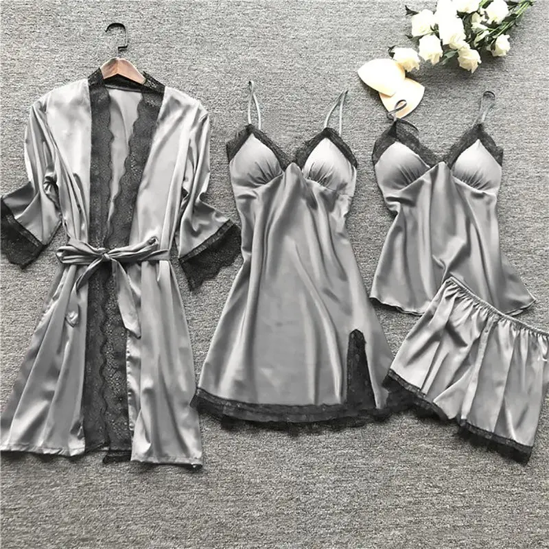 WENYUJH 2021 сексуальный халат комплект мягкая Пижама Топ домашняя одежда для женщин из четырех предметов однотонная Пижама для женщин сексуальная мода для сна Топ для невесты
