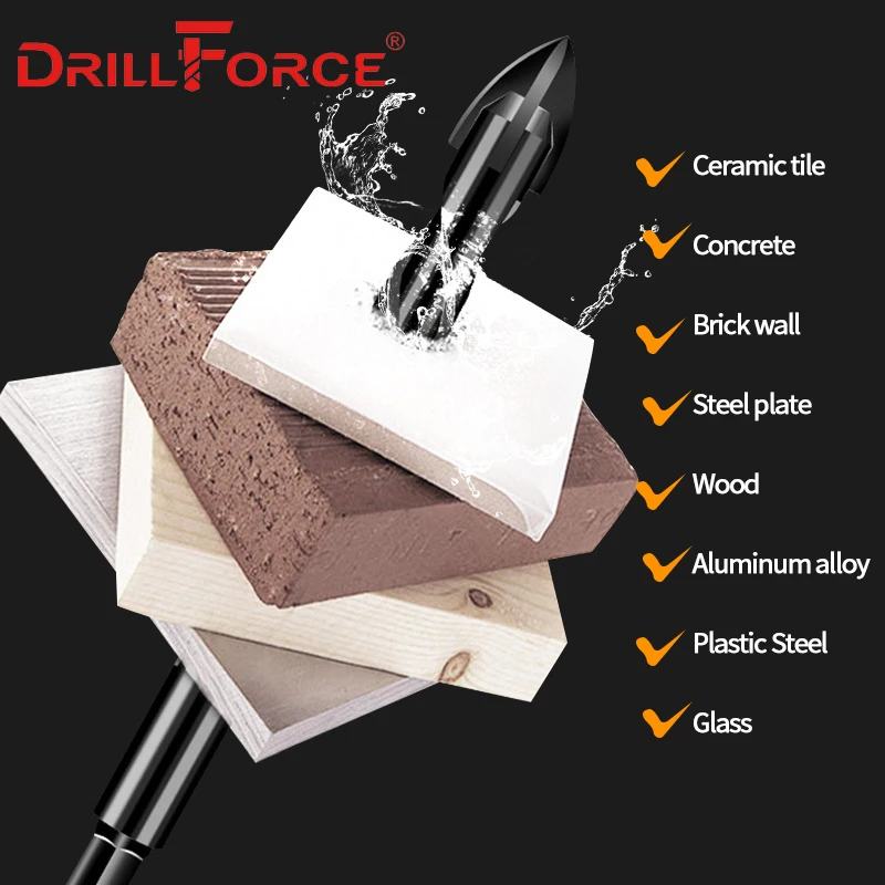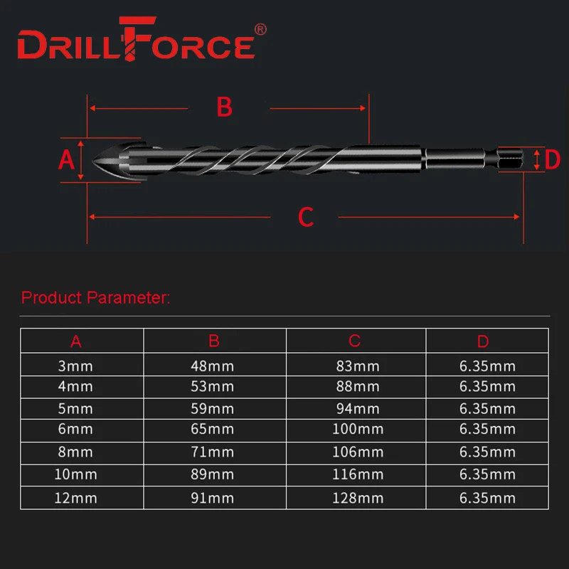 Drillforce 5 шт. сверла для стекла, керамики, бетона, плитки, Открыватель отверстий, 4 лезвия, карбидный наконечник, спиральный крест, шестигранное сверло 456810 мм
