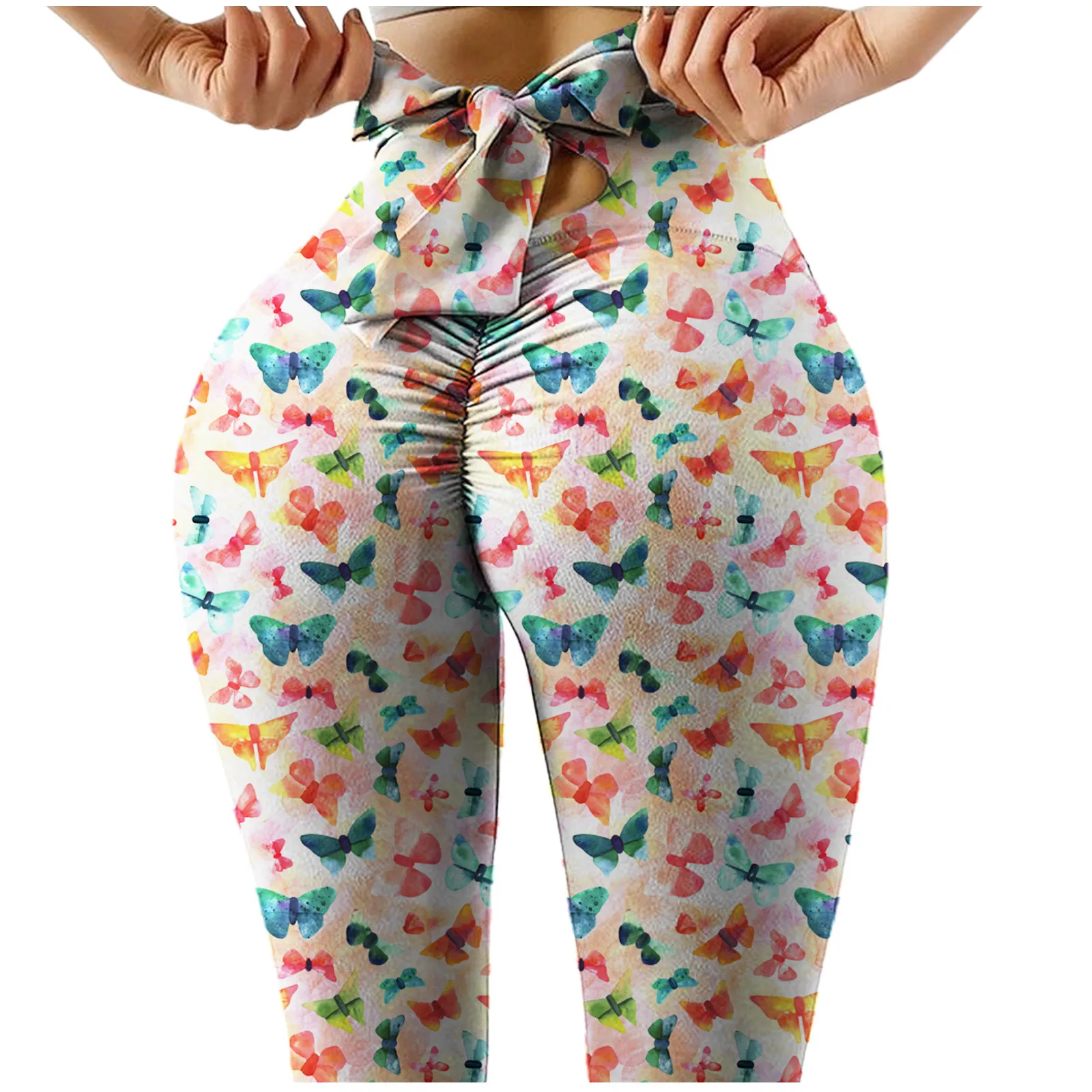 Женские леггинсы с высокой талией и принтом, бесшовные эластичные спортивные штаны для фитнеса и бега, летние леггинсы с бантом и высокой талией