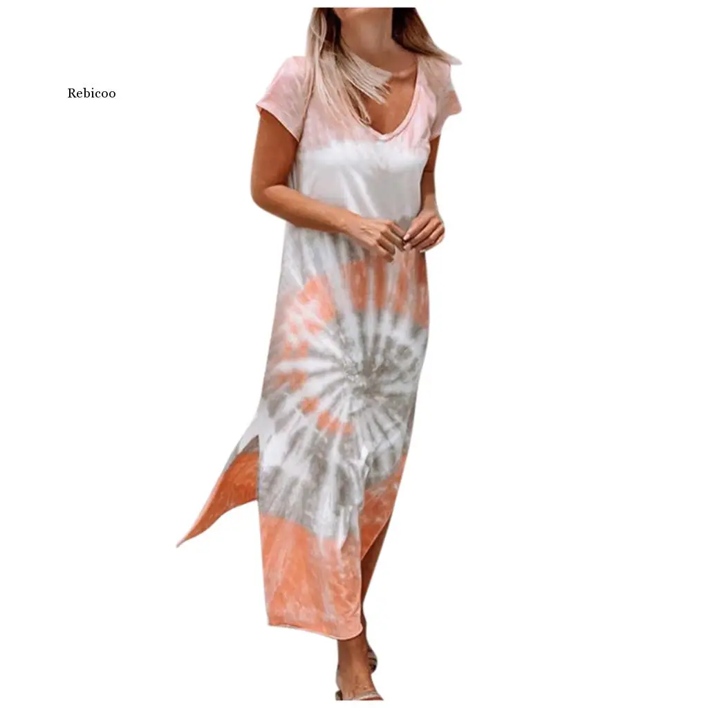 Женские длинные платья в богемном стиле, повседневные размера плюс платья макси с V-образным вырезом и принтом тай-дай, с разрезом и коротким рукавом, вечерние размера плюс # js5