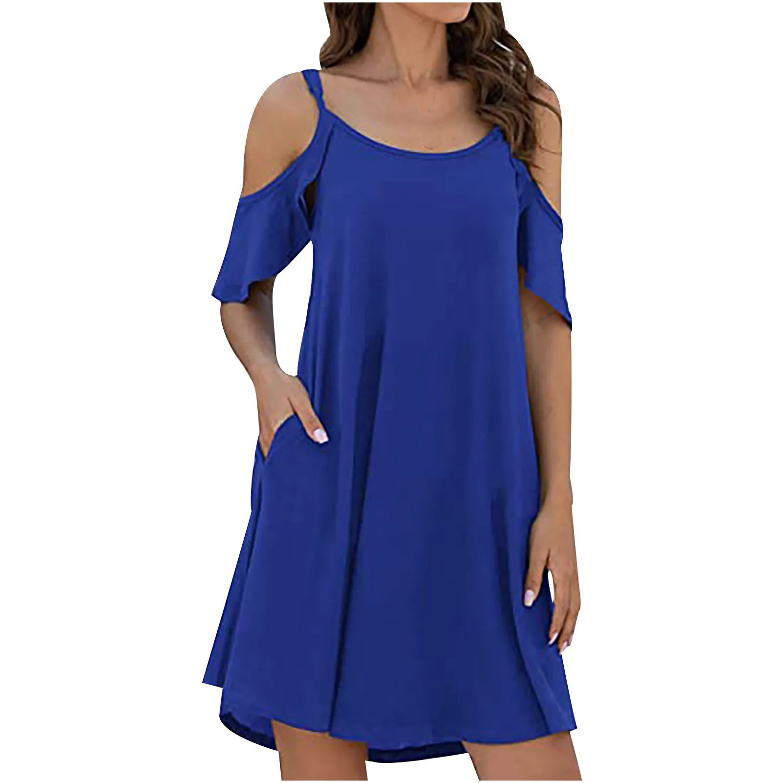 Женское платье с круглым вырезом и повседневные однотонные Цвет карманы короткий рукав длиной выше колена мини-платье с коротким рукавом для девочки, летняя детская сумка Хип круглый рек платье