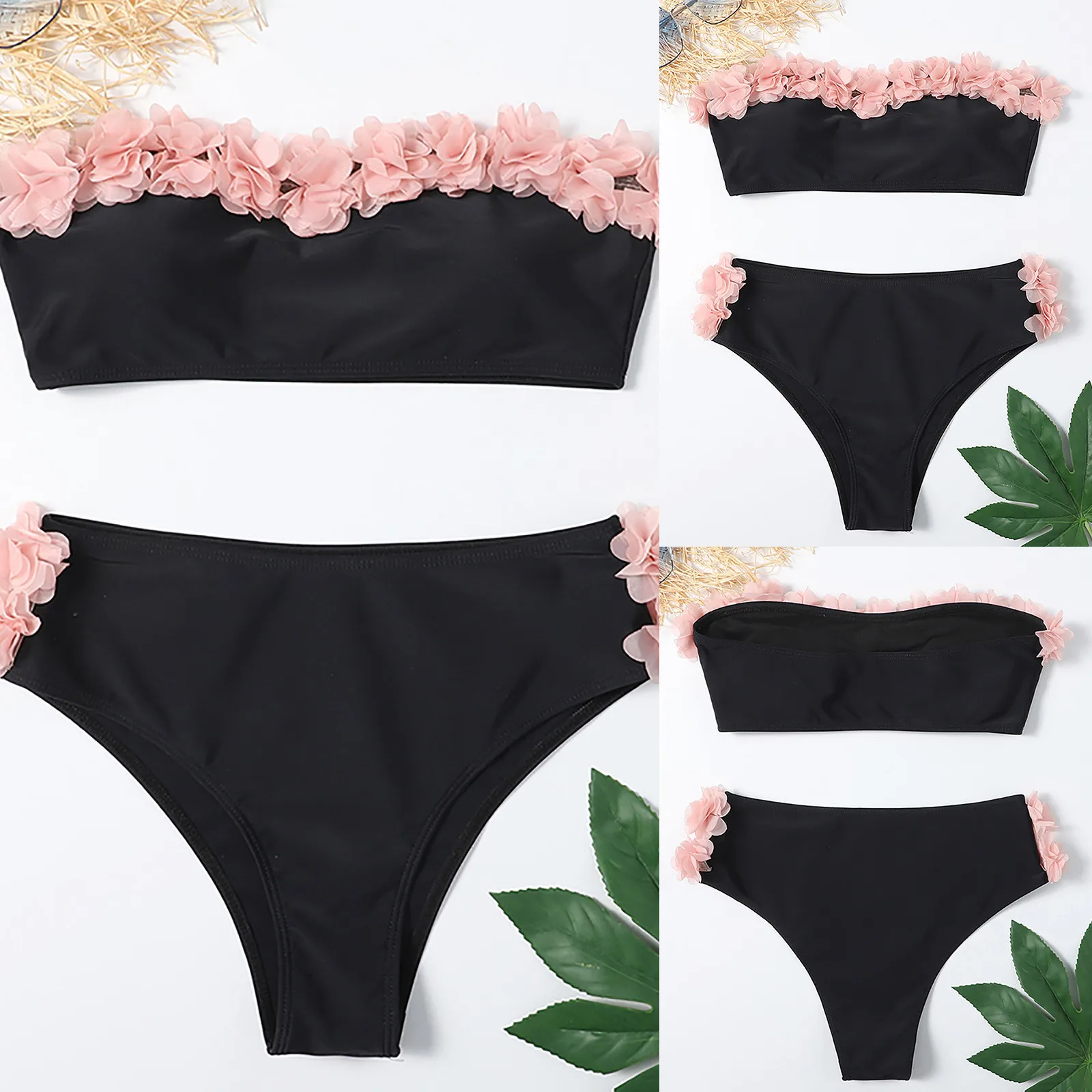 Милый женский купальник-бикини с цветочным рисунком, черное бикини ...
