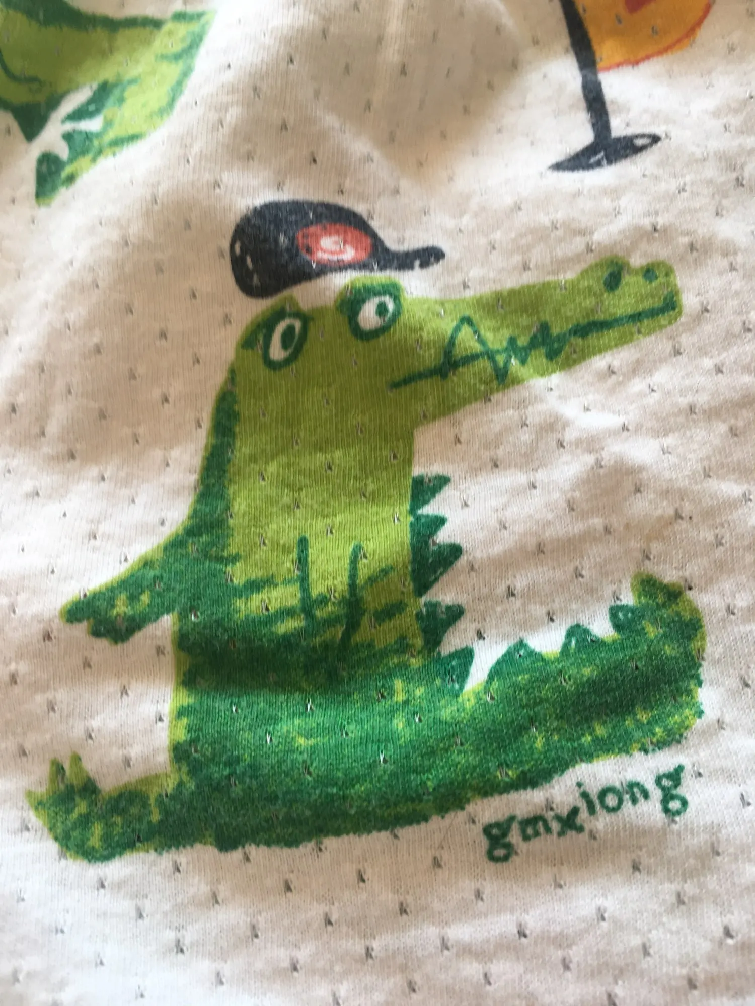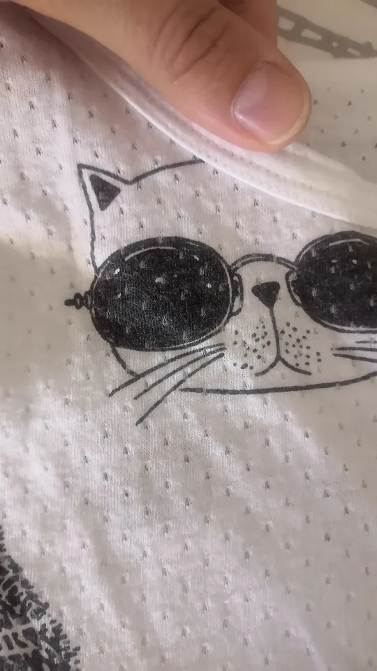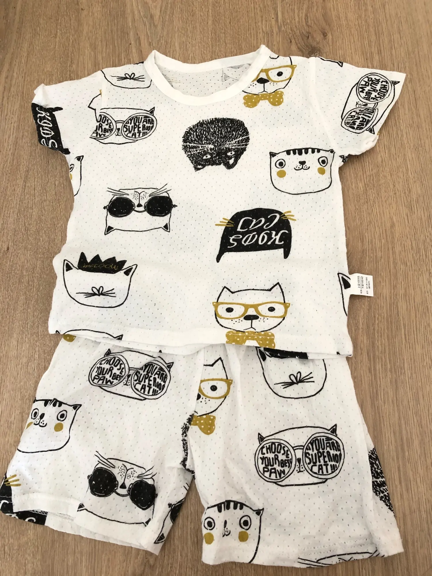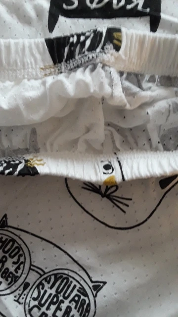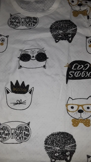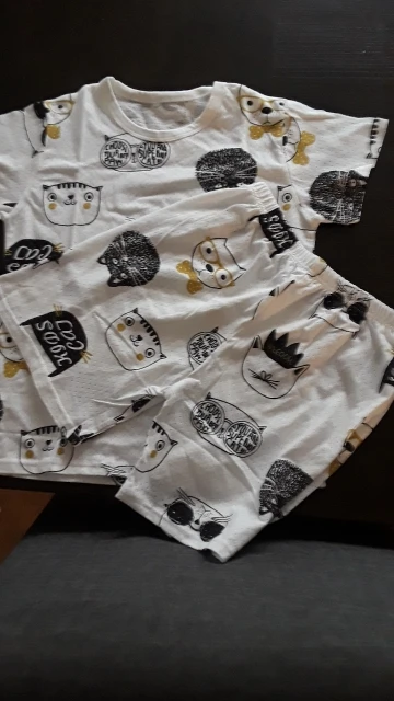 Выглядит мило. Таблица размеров также подходит (немецкий размер соответствует 116), к сожалению, после стирки при температуре 40 градусов рисунок (черный на белом) уже очень бледный. Тем не менее, милая легкая Пижама на лето.