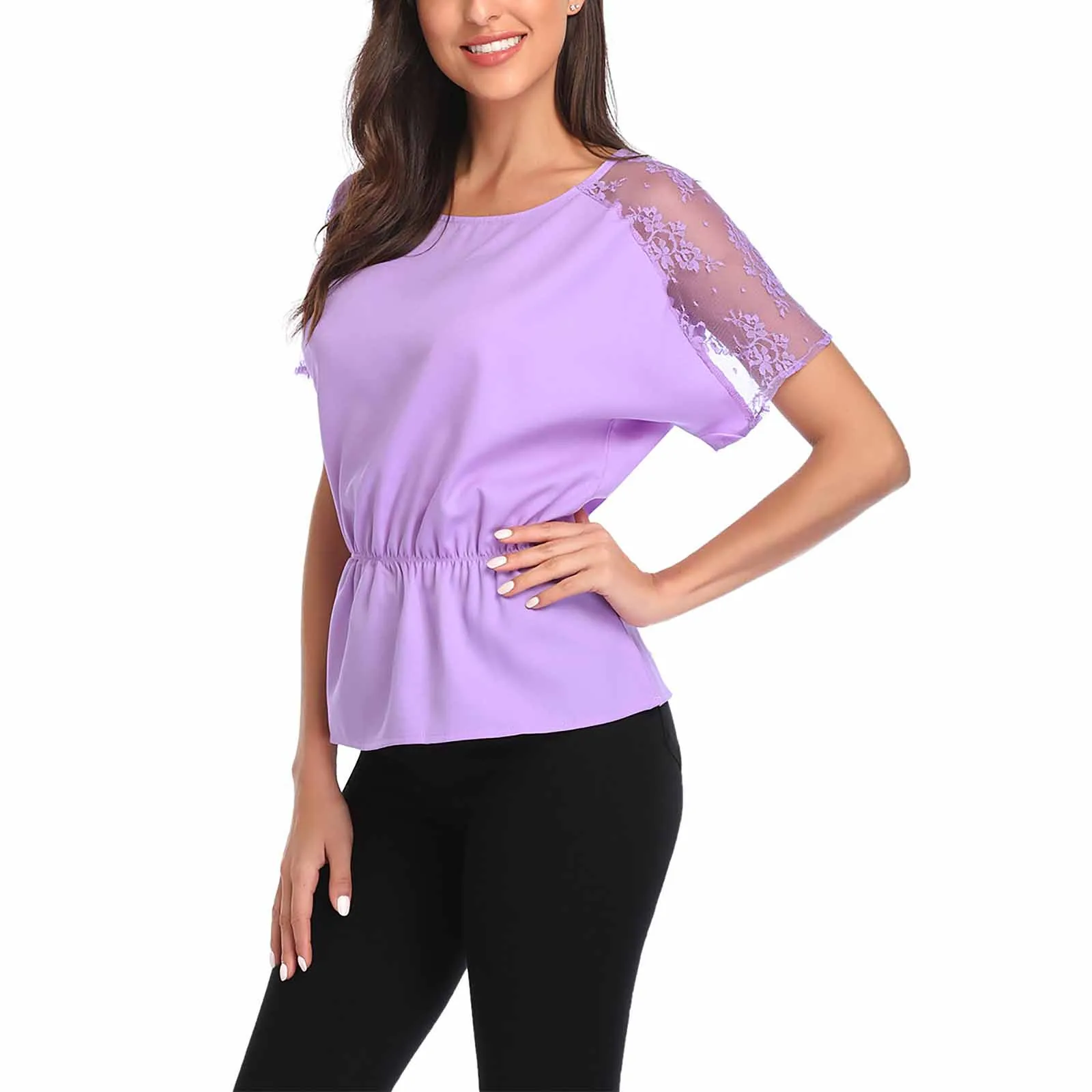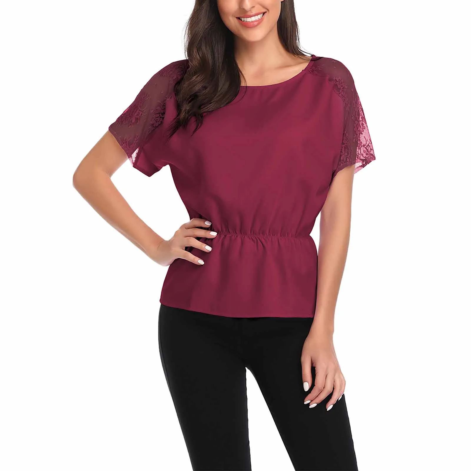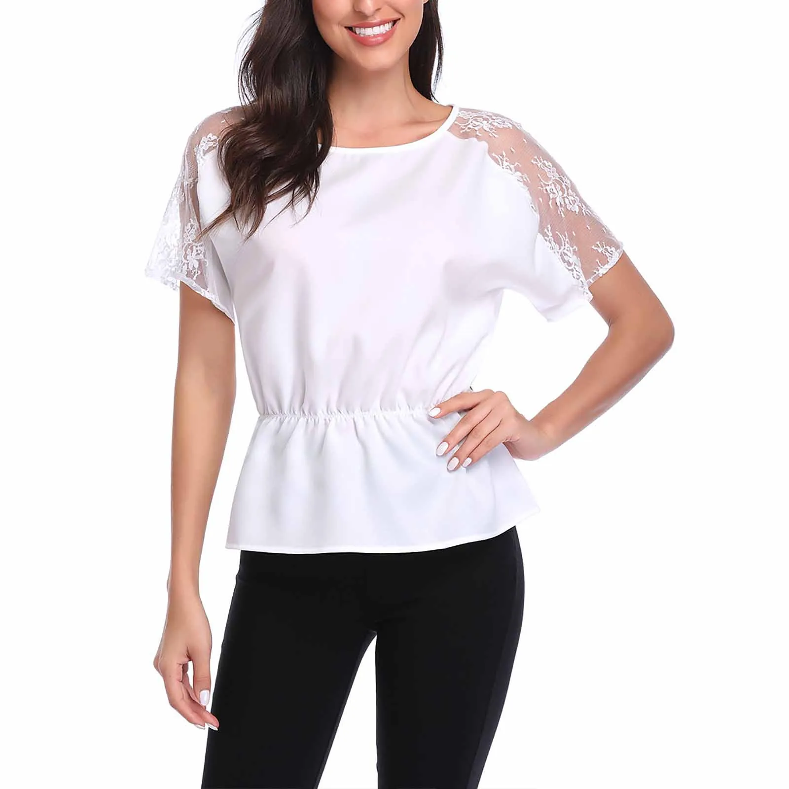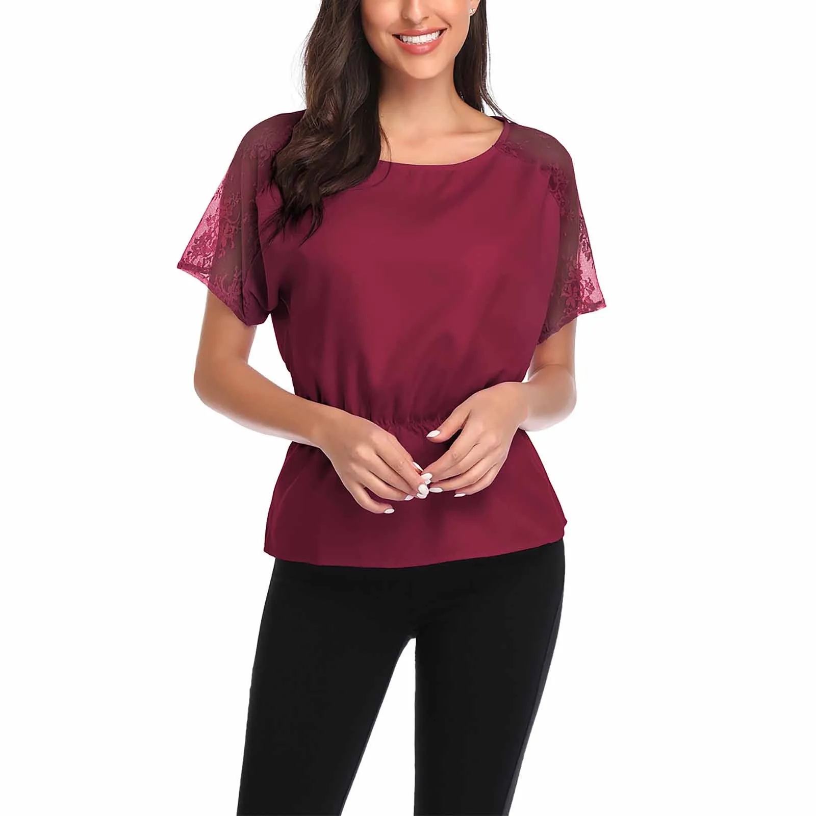 Женская модная повседневная универсальная Кружевная футболка с коротким рукавом и 0-образным вырезом