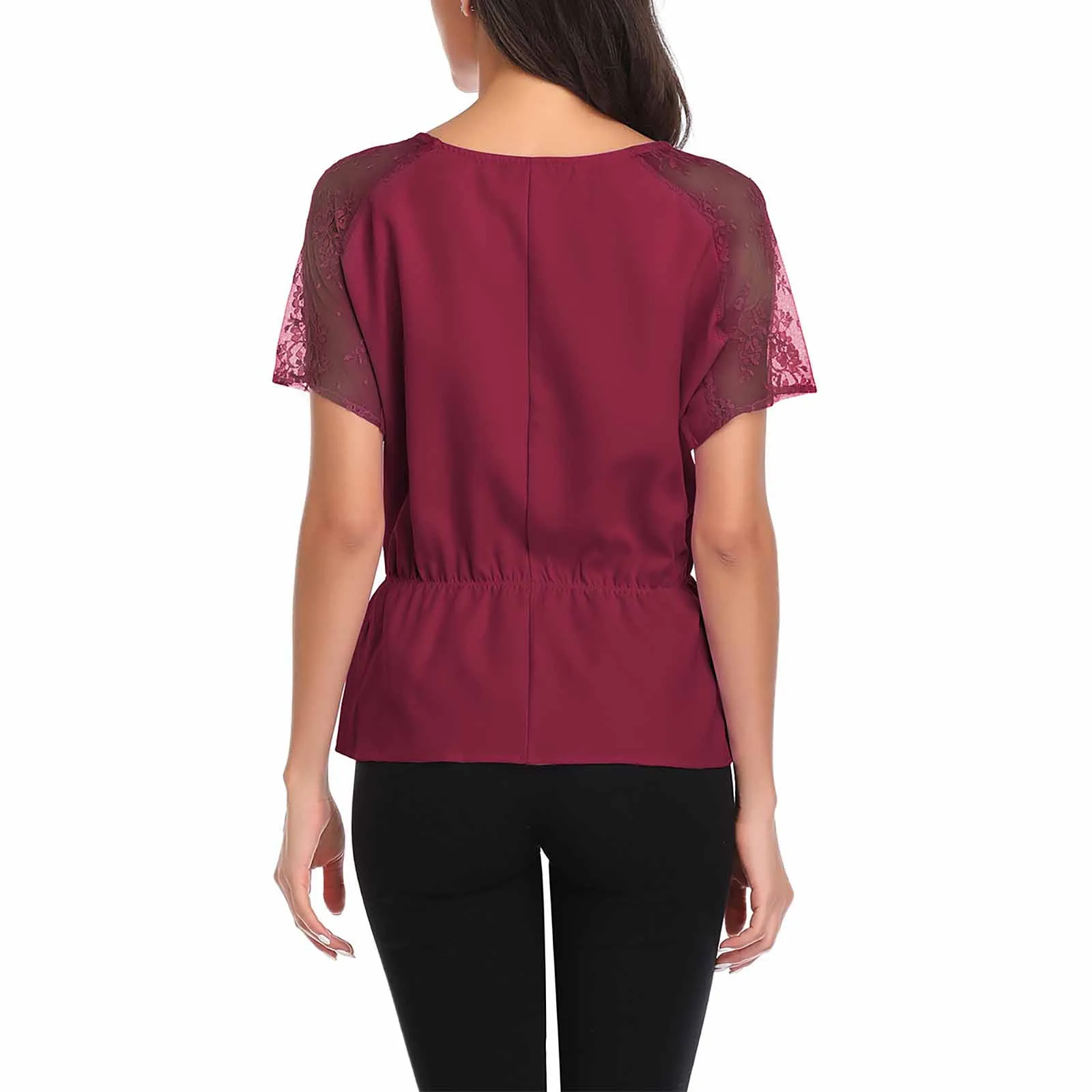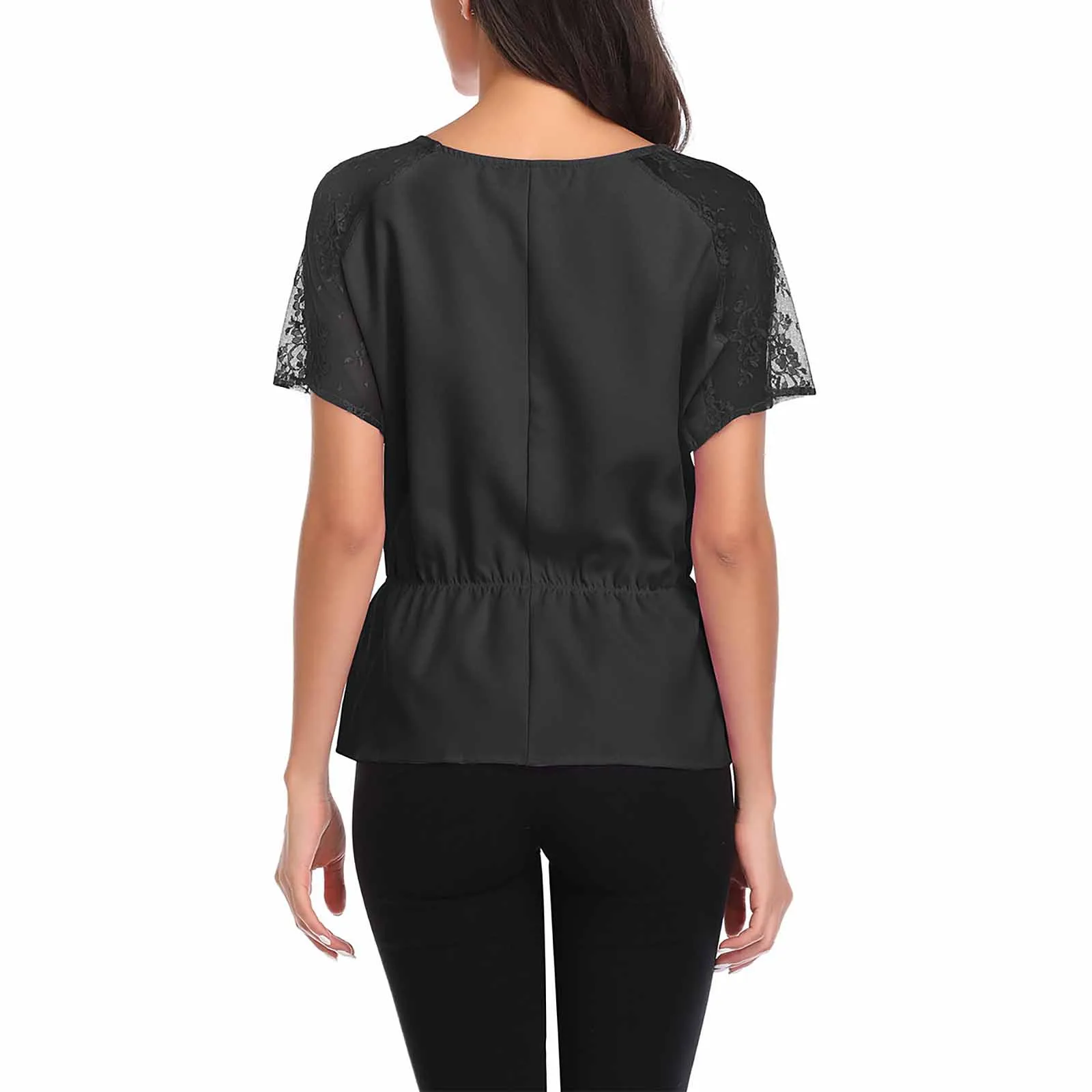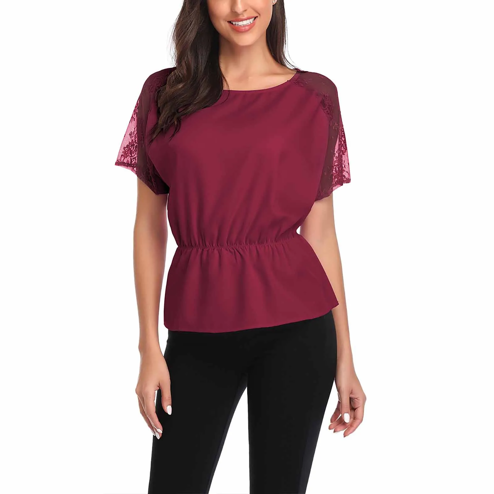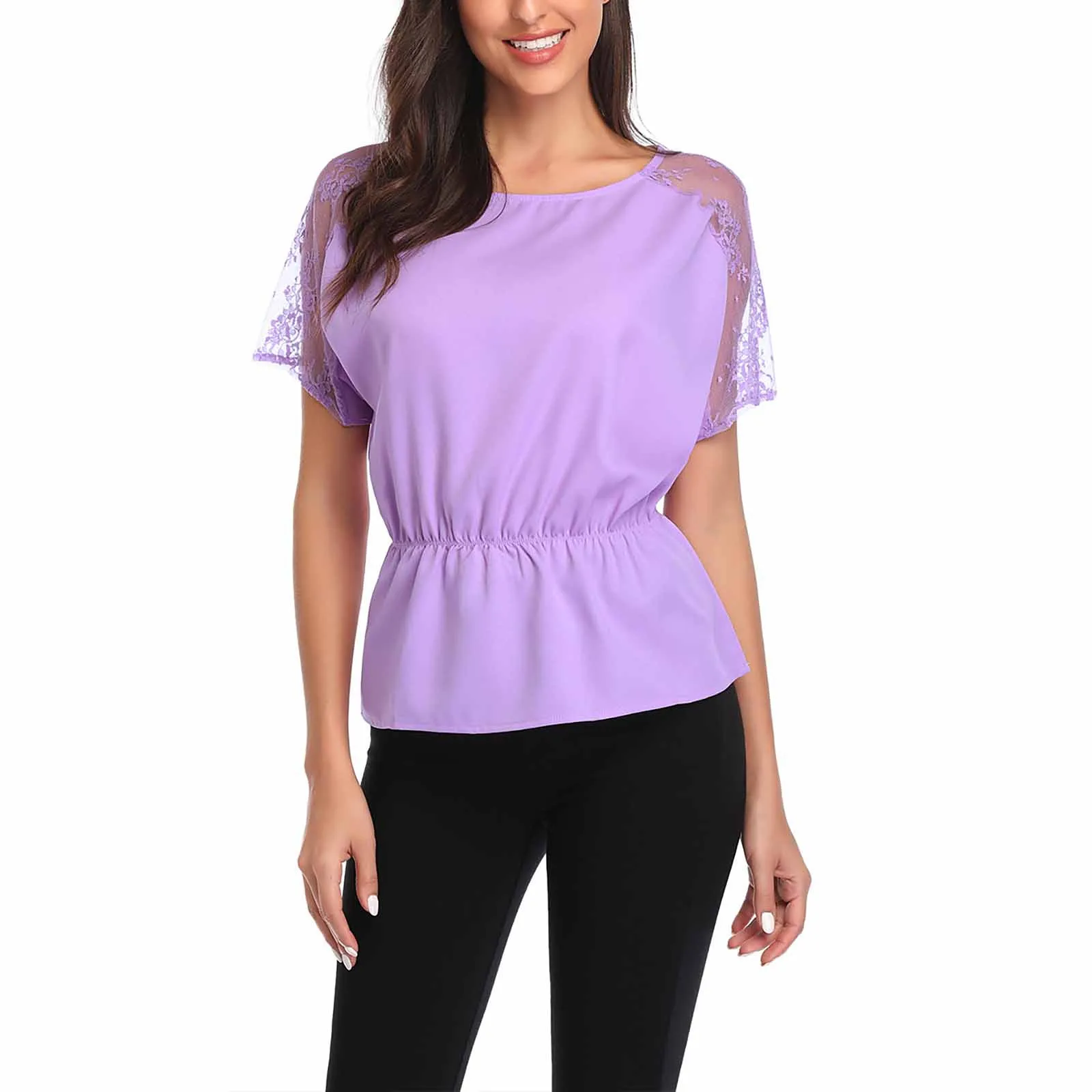 Женская модная повседневная универсальная Кружевная футболка с коротким рукавом и 0-образным вырезом