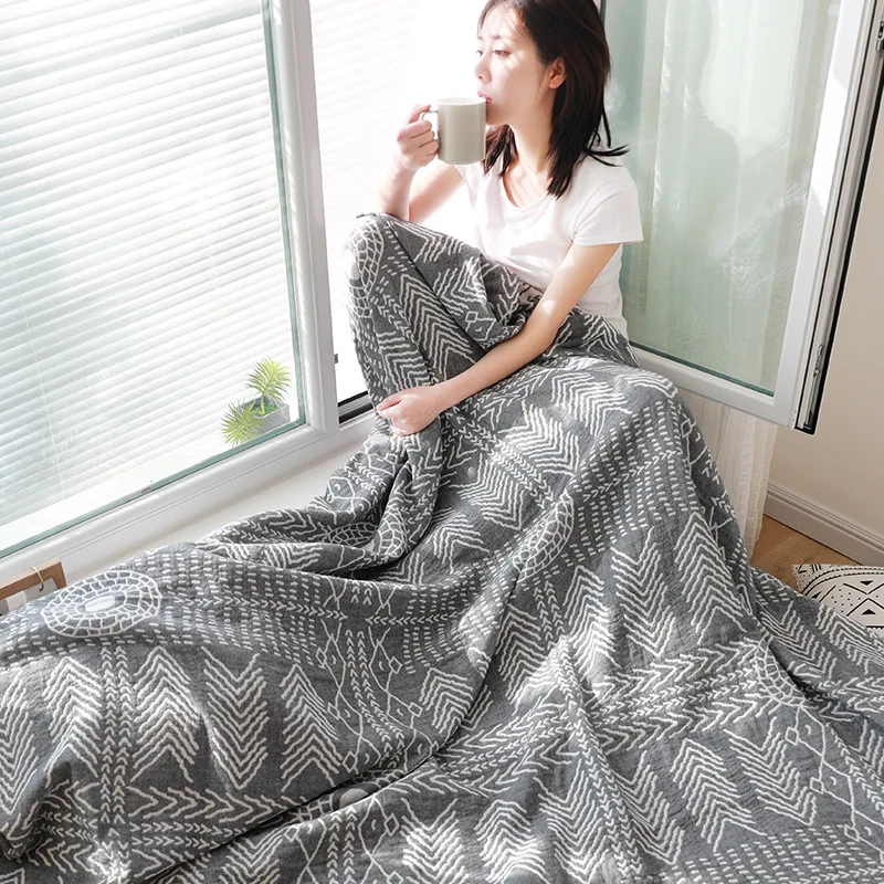 Спецификация Материал: хлопок Размер: 150x200 см/200x230 см Цвет: серый, синий Подходящий сезон: весна/лето/осень Узор: Геометрия Примечание: возможна погрешность в 1-3 см и небольшая разница в цвете в интернет-магазине. Характеристика 1. Изготовлен из высококачественного материала, безвреден для вашего тела. 2. Ткань мягкая и удобная, гибкая, Антистатическая. 3. Применимо: кровать, офис, диван, кровать, путешествия, самолет, отель и т. Д. 4. Милый подарок для вашей семьи, детей и друзей. Посылка включает: 1 х газовое полотенце одеяло