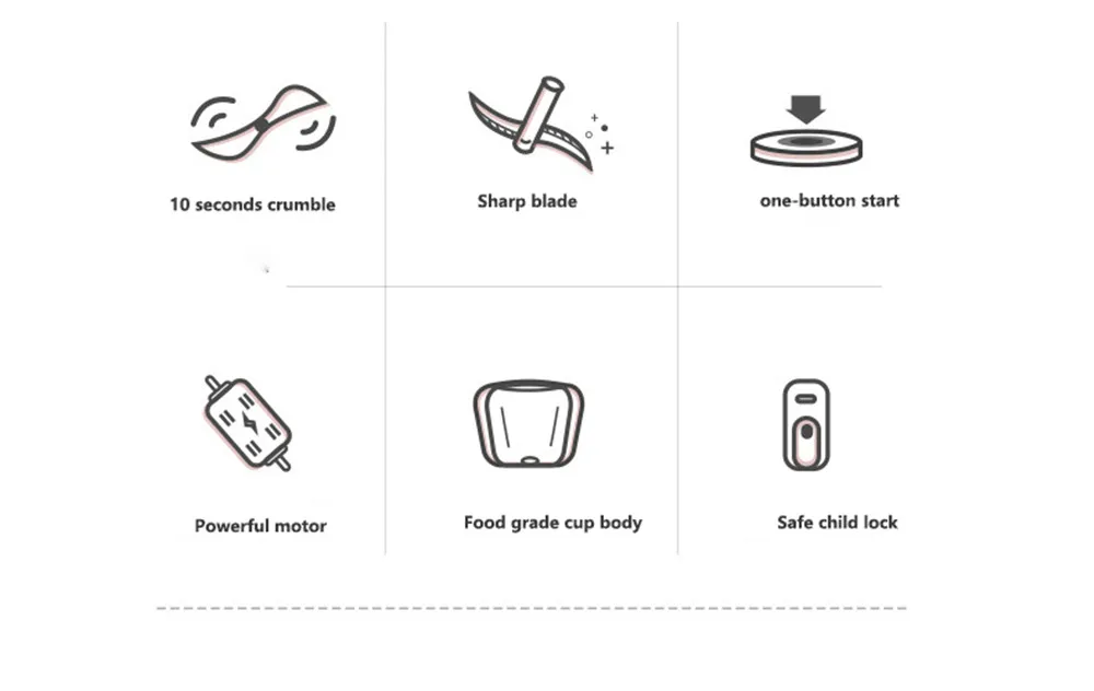 Особенности 1. Электрическая дробилка: электрическая дробилка позволит вам попрощаться с ручной тягой, которую вы можете просто нажать кнопку сверху, чтобы автоматически раздавить его. 2. Прочный и долговечный: лезвие из нержавеющей стали является прочным и может эффективно резать. Пищевой пластик в чашке не содержит BPA, может безопасно держать еду, сильный и не содержит бактерий. 3. Быстро нарезать: острое лезвие измельчителя чеснока может быстро нарезать чеснок, приправы, орехи, овощи, мясо, кубики льда и т. Д. Он очень подходит для небольших продуктов. Вы можете использовать его для приготовления пищи, детского питания, коктейльных напитков. 4. Простая чистка: просто положите еду или ингредиенты в мини-кухонный комбайн вручную, закройте крышку и начните с одной кнопки, чтобы быстро нарезать еду. Миску и лезвие можно отделить для легкой очистки. 5. Идеальный кухонный инструмент для измельчения чеснока, измельченного имбиря, измельченного свежего Чили, измельченного арахиса, молотого мяса, тыквенной пасты и т. д., который является незаменимым артефактом для любителей пищевых исследований. Спецификация: Материал: PC, PP пластик Питание: зарядка через USB Номинальная мощность: 30 Вт Батарея напряжение: 3,7 V Номинальное напряжение: 5 В Лезвие: нержавеющая сталь 304 Емкость: около 250 мл Размеры: около 9,7*8,7*8,7 см/3,82*3,43*3,43 дюймов Цвет: белый, розовый, зеленый Посылка включает: 1 * USB кабель 1 * электрическая давилка чеснока Примечание 1. Фактический цвет может быть s светильник, который сильно отличается от изображения из-за различных эффектов монитора и светильник. Возможны отклонения на 1-3 см вследствие измерений вручную. 2. Объекты могут иметь логотип, если вы хотите знать, пожалуйста, свяжитесь с нами. Если вы возражаете, пожалуйста, не предлагайте цену