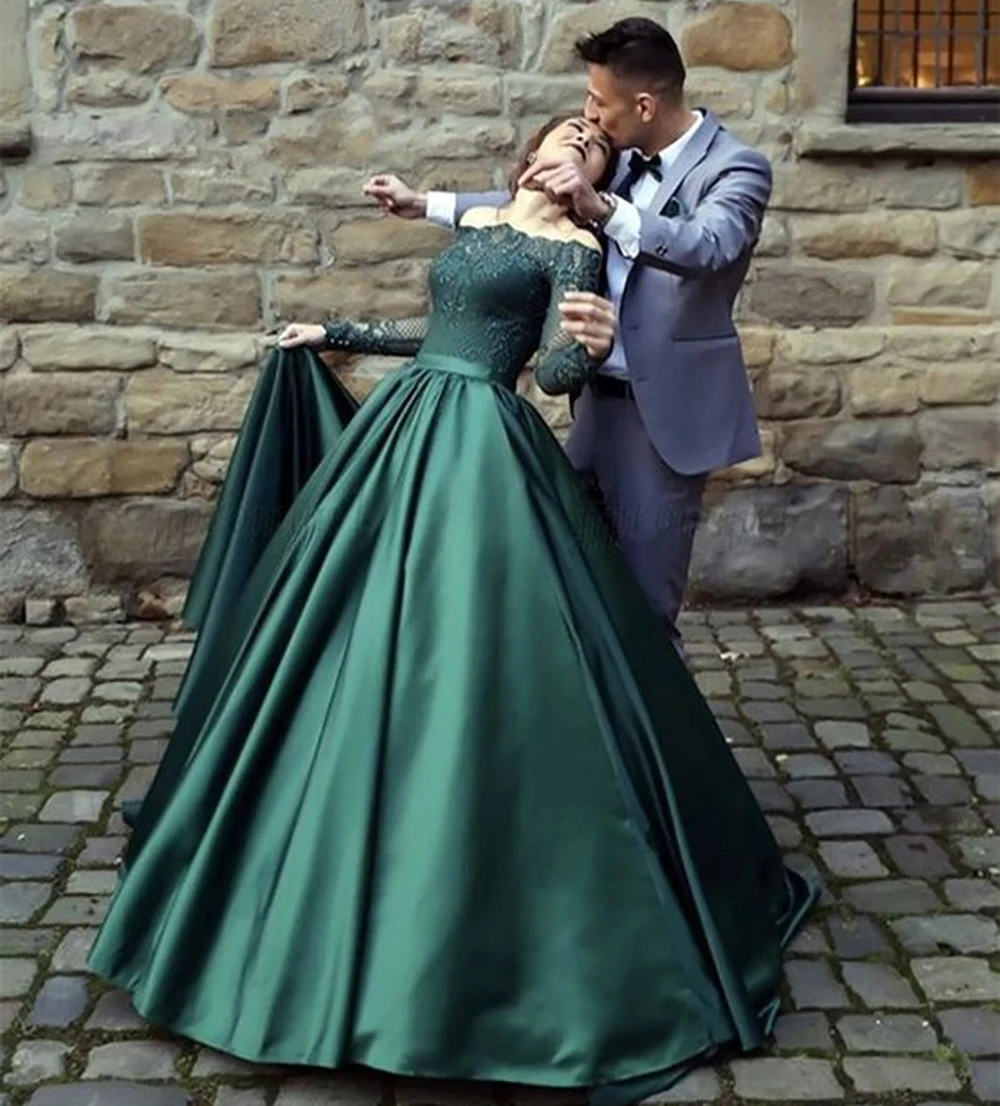 С открытыми плечами атласное торжественное платье вечерние бальное платье Новое Элегантное платье в мусульманском стиле с длинным рукавом Кружева изумрудно-зеленый вечерние платья
