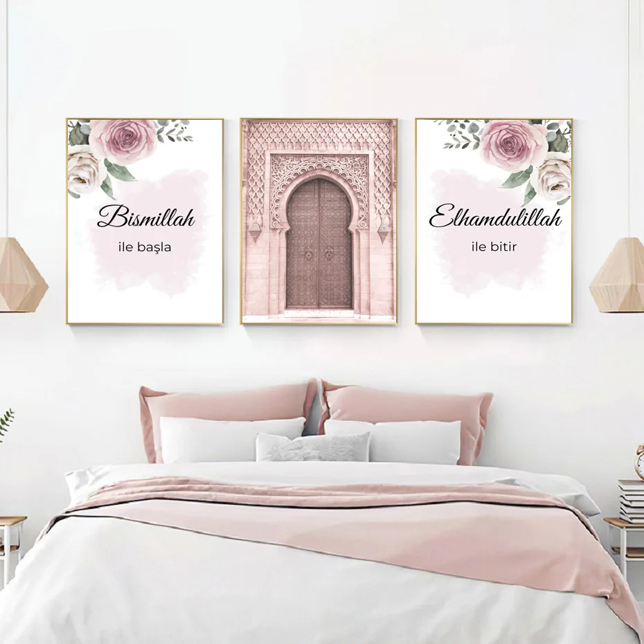 Современное украшение для дома с розовыми цветами, настенное искусство, Картина на холсте, мусульманская исламская архитектура, плакат, художественное украшение для дома