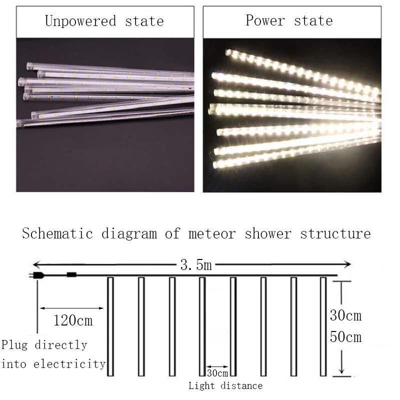 1. Эффект метеоритного дождя, романтическая эстетика2. Светильник каждой лампы включается и выключается один за другим последовательно и быстро, как метеоритный дождь или падающий снег в ночном небе3. Применение: рыночное инженерное освещение, архитектурное украшение, украшение деревьев вдоль улиц, парки, украшения, декоративные реки, городское ночное освещение4. Водонепроницаемый, пыленепроницаемый, устойчивый к коррозии5. Низкое энергопотребление, энергосбережение