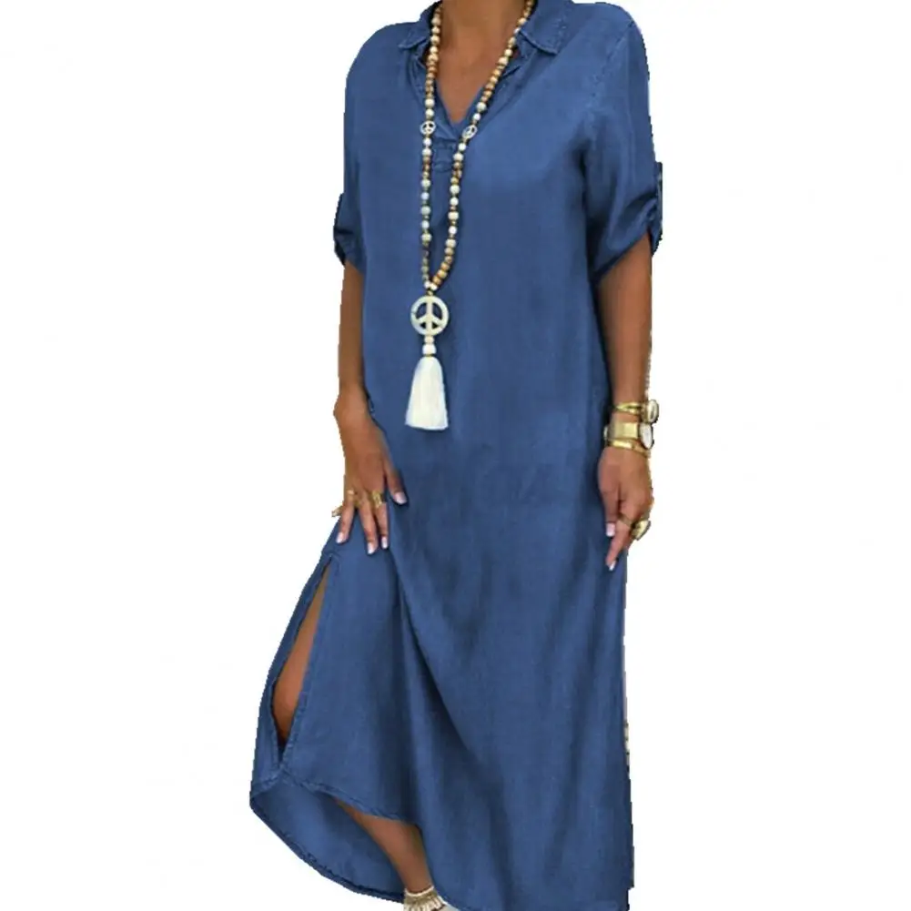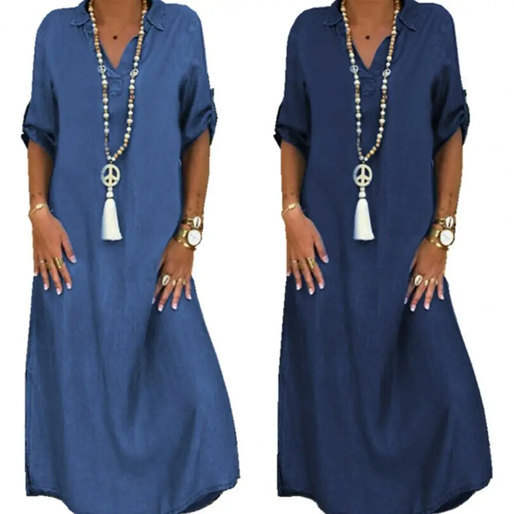 Повседневное женское платье с коротким рукавом Сторона разрезая подол с v-образной горловиной, свободного покроя, джинсовое платье с длинными рукавами модный свитер платье для женщин размера плюс