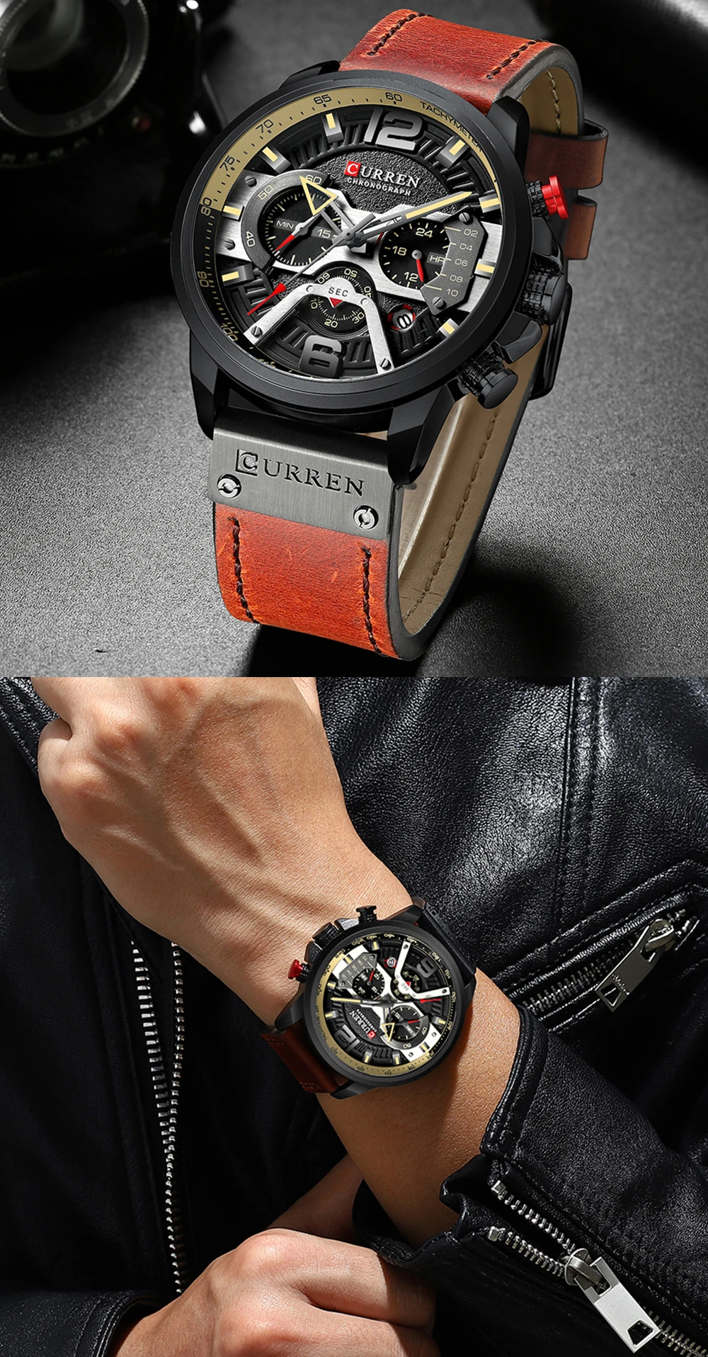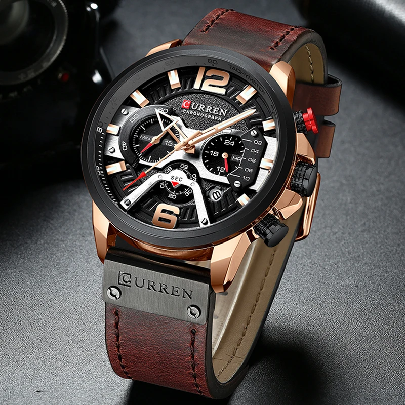 Часы-хронограф CURREN Мужские, Брендовые повседневные спортивные наручные, в стиле милитари, с кожаным ремешком