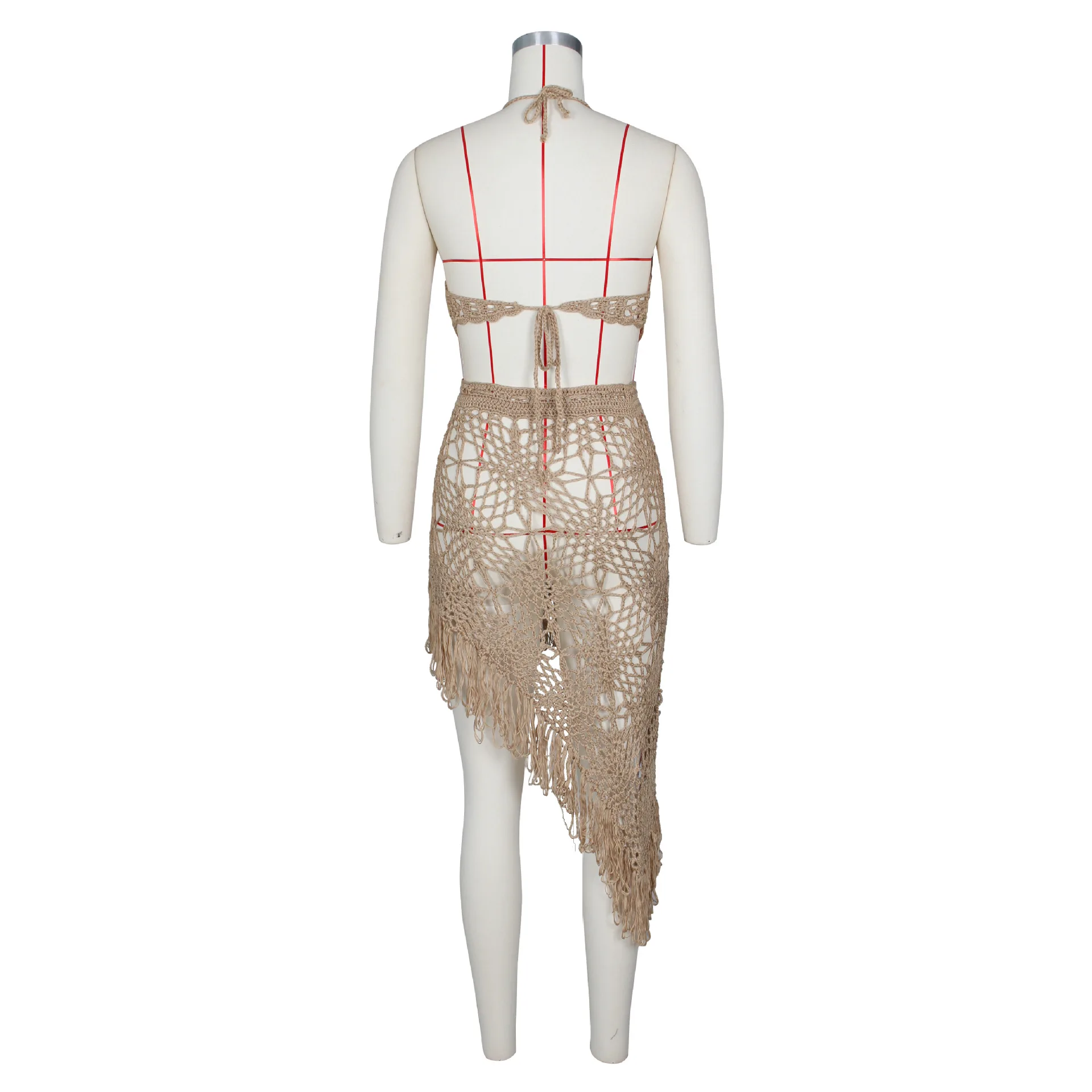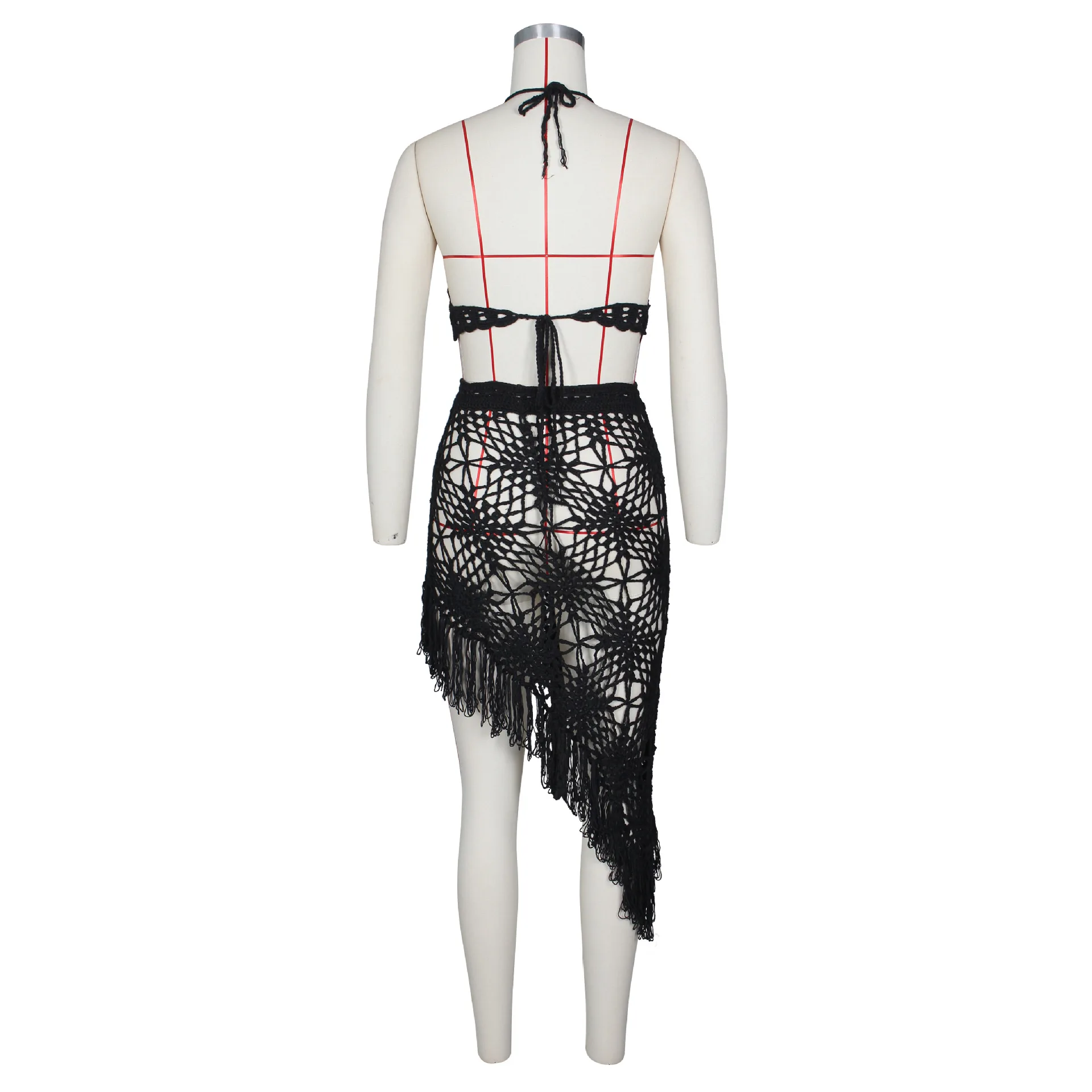 Женский вязаный комплект RT, с кисточками, короткий топ на завязках, асимметричная юбка, вязаный комплект из двух предметов, сексуальная пляжная одежда