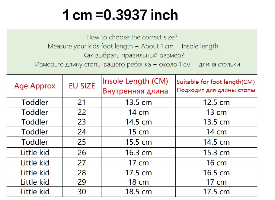 Дорогие друзья: Поскольку все размеры детской обуви отличаются, при заказе детской обуви необходимо ориентироваться на наш размер и внутреннюю длину. В соответствии с длиной стельки. (Длина стельки = длина стопы 1 см/1,5 см) размер США не является стандартным, Просто удобно делать заказ. Комфортной длиной является длина стопы прибавьте около 1 см. И из-за длительного времени доставки к авиа-отправление Почты Китая году и ребенок будет расти быстро, пожалуйста, выберите обувь на размер больше для вашего ребенка. Пожалуйста, выберите правильный размер. Вся обувь будет отправлена в пузырчатых пакетах, без коробок!