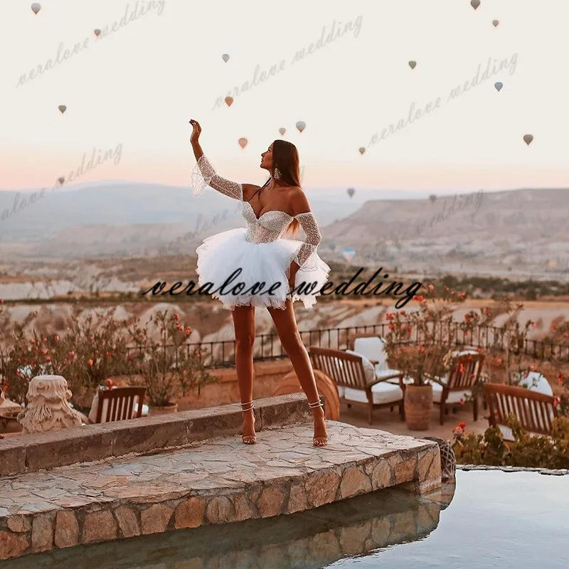 Короткое свадебное платье с V-образным вырезом и длинными рукавами,...