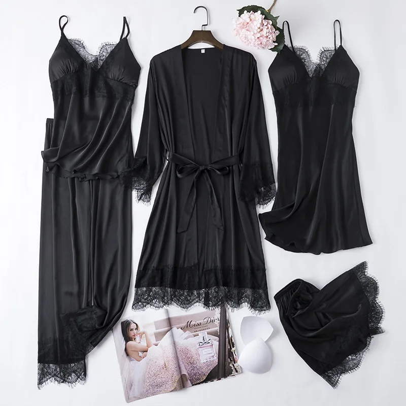 Комплект пижамный женский атласный, кружевная ночная рубашка, пикантный пижамный комплект черного цвета, ночной купальный халат, одежда для сна, домашняя пижама, 5 шт.