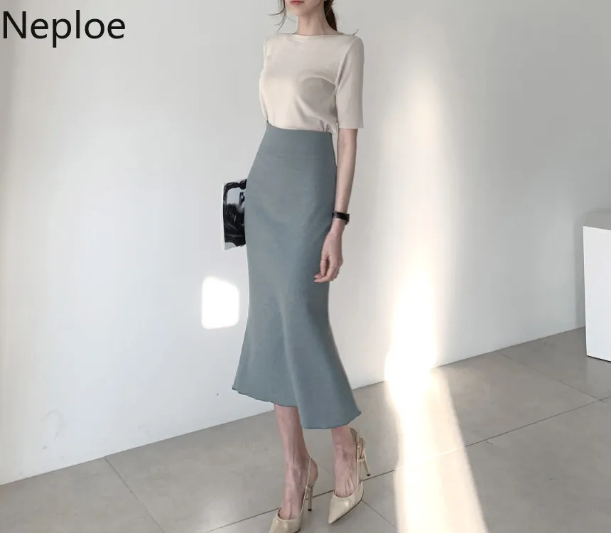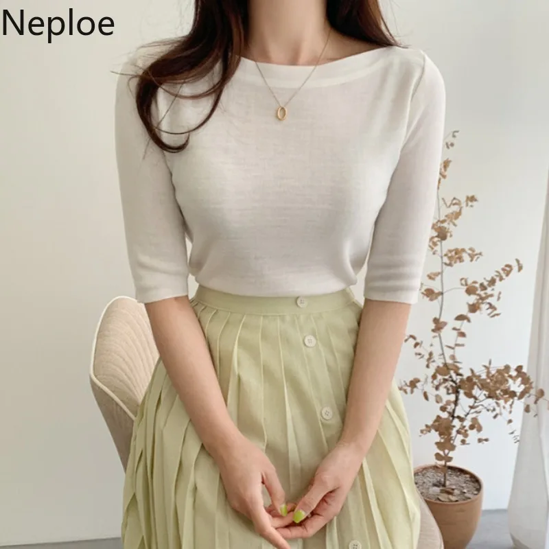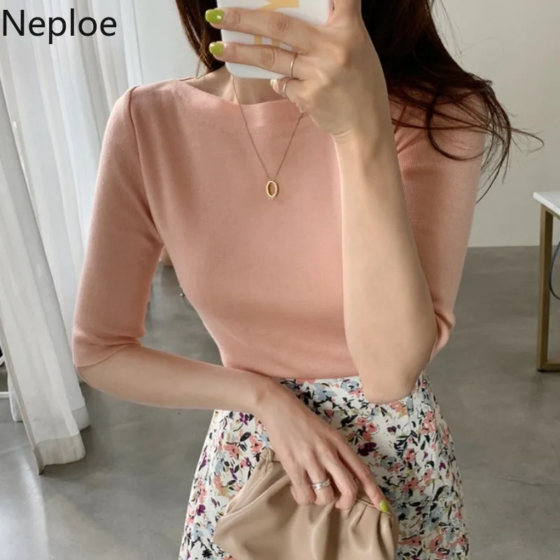 Хлопковая Базовая футболка Neploe, Женские однотонные топы с круглым вырезом и рукавом до локтя, Летние повседневные облегающие дамские футболки, новинка 2021, 1C093