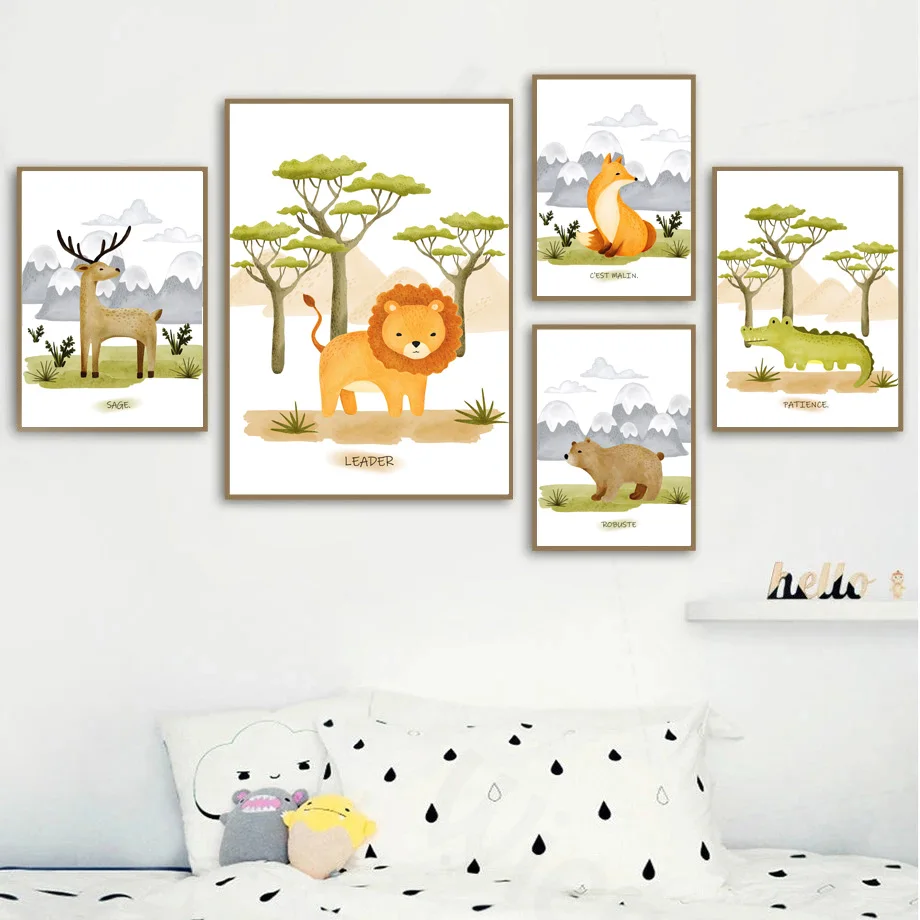 Милый мультфильм животных Лев Зебра Детская настенная живопись холс...