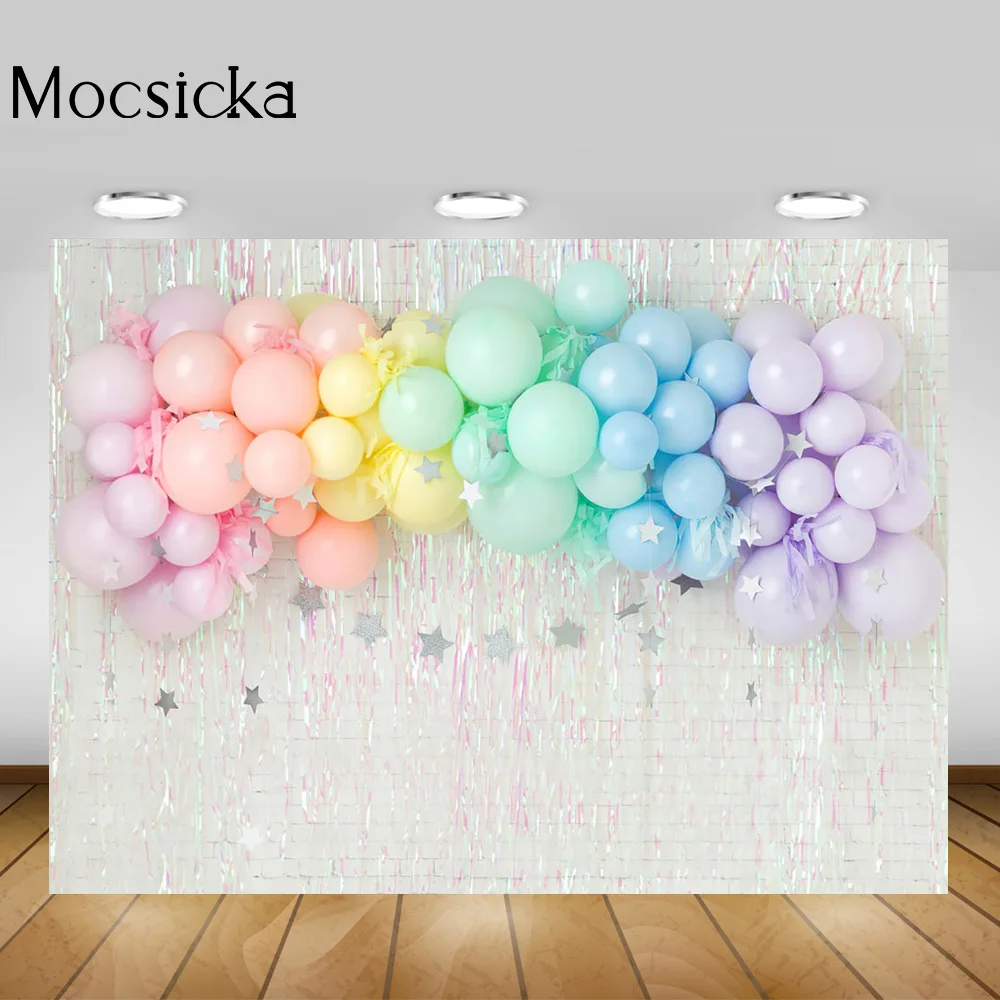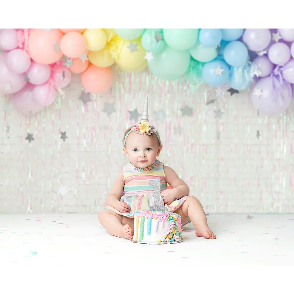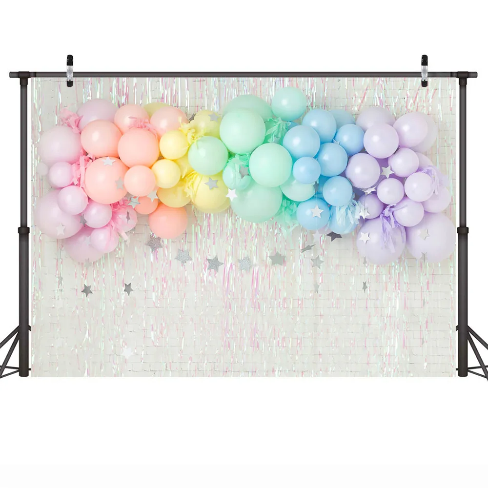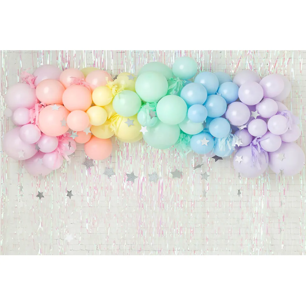 Фон для детской фотосъемки с изображением пышных радужных воздушных шаров серебряная звезда