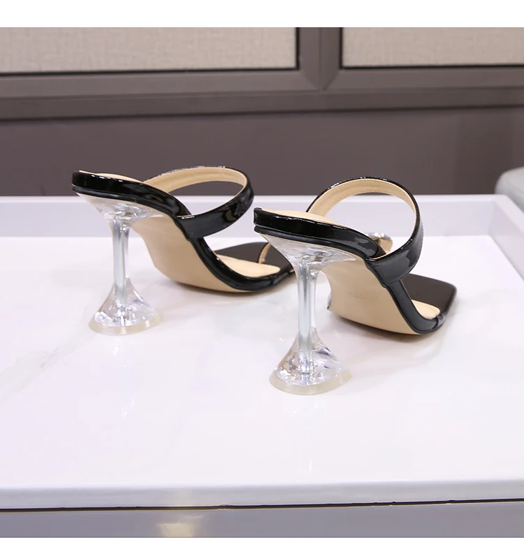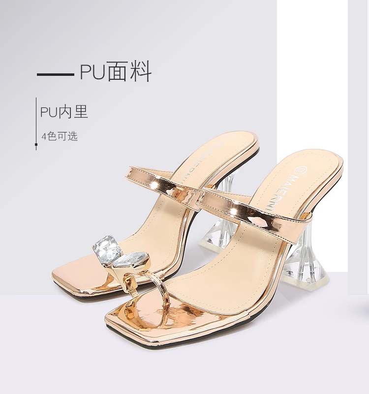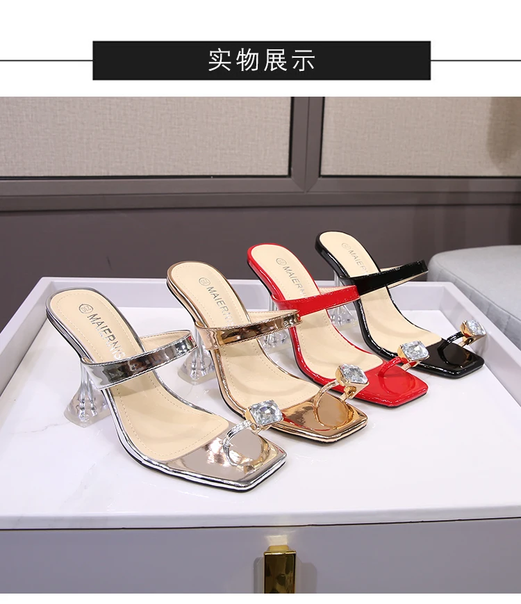 Женские шлепанцы с зажимом, стразы, открытые шлепанцы с хрустальной чашкой на каблуке, босоножки с узкой полосой, лето Прозрачные Высокие каблуки г., 2021