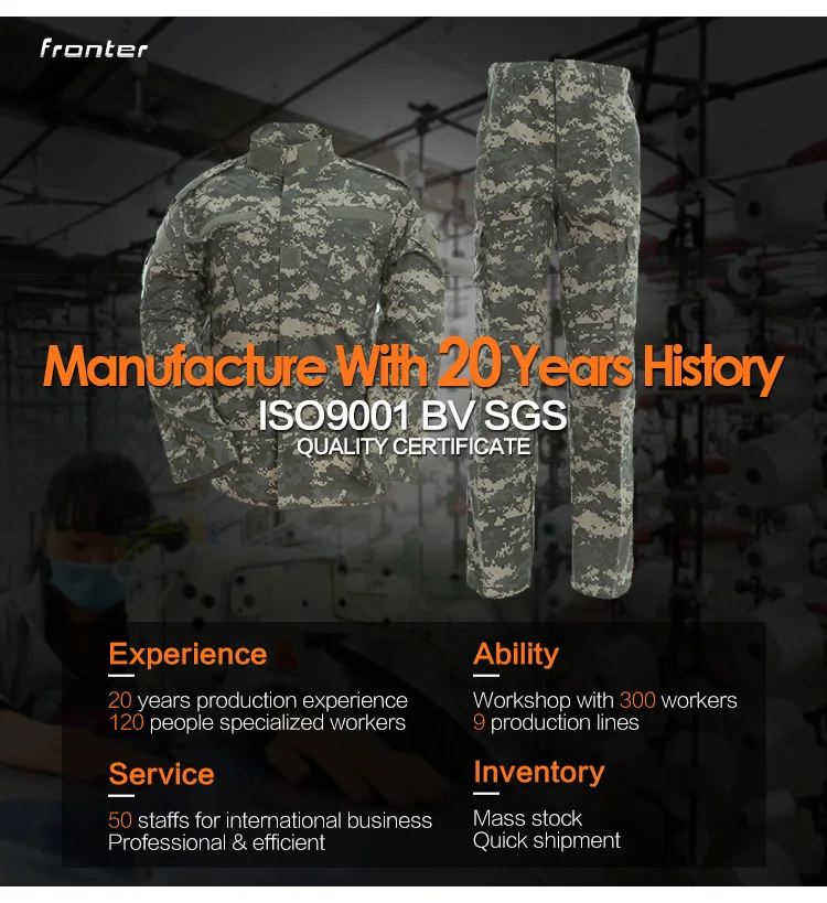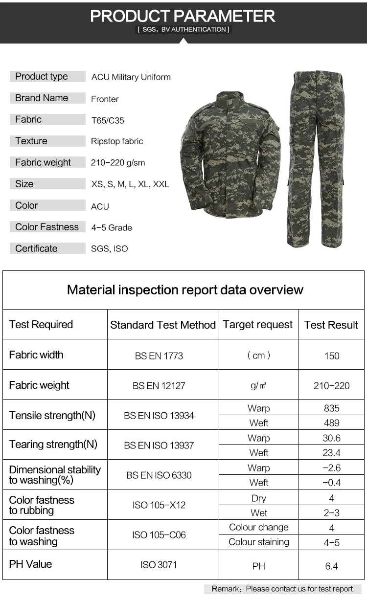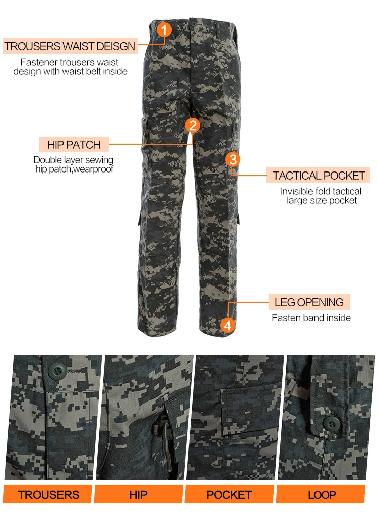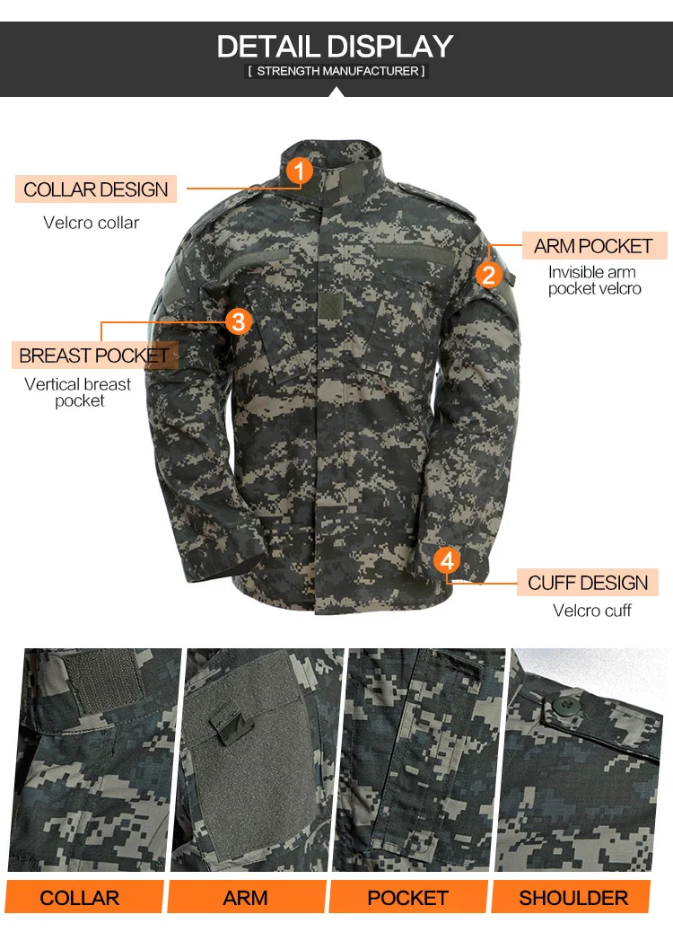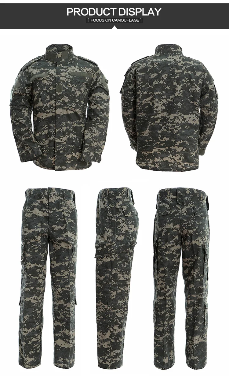 В основном применяется в военной форме армии США (ACU), универсальный камуфляжный рисунок (UCP, также известный как ACUPAT или «digicam»), был разработан как «Универсальный Камуфляж», который одинаково хорошо работает во всех средах независимо от пустыни, леса/джунглей или города, Что устранило бы необходимость выдавать специальную камуфляжную одежду для солдат, дислоцированных в различные географические районы. Состоит из серого сланца, пустынного песка и листвы зеленого цвета, который становится темнее или светлее в зависимости от воздействия солнечных лучей, камуфляж ACU, однако, не был хорошо получен и снят после нескольких лет службы.Наша улучшенная версия UCP стала ACU color, которая сохраняет преимущества оригинальной версии и улучшает недостатки оригинальной версии.