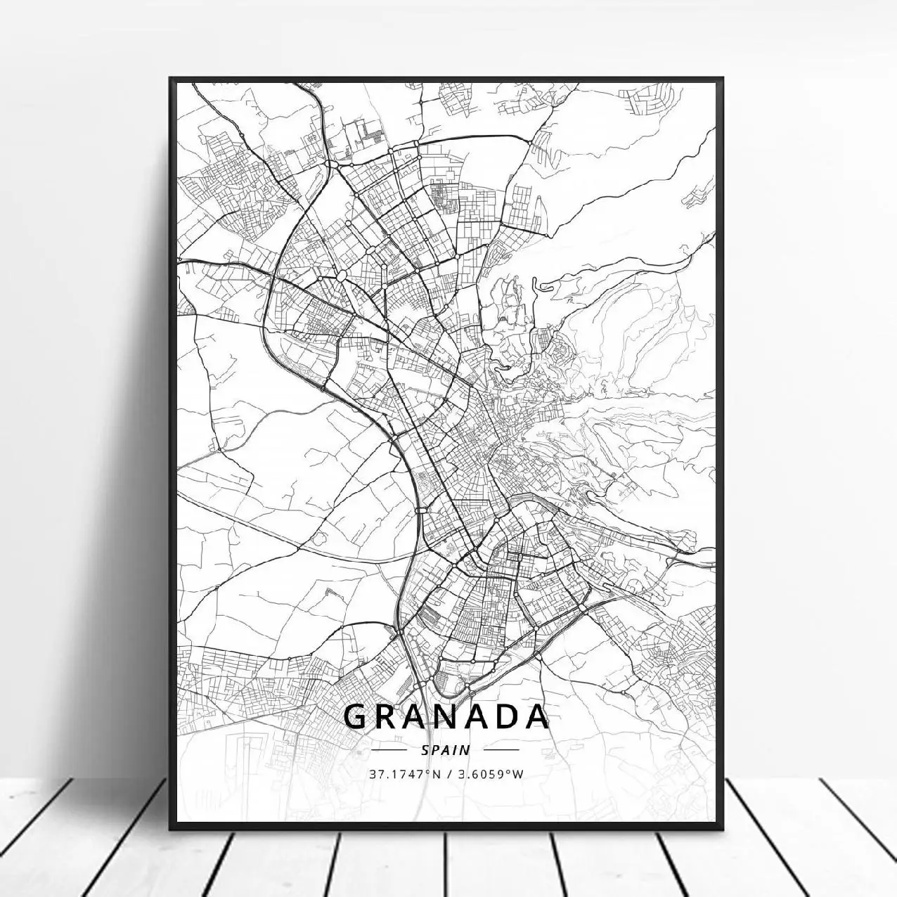 Плакат с изображением карты города Барселоны, черно-белая типографи...