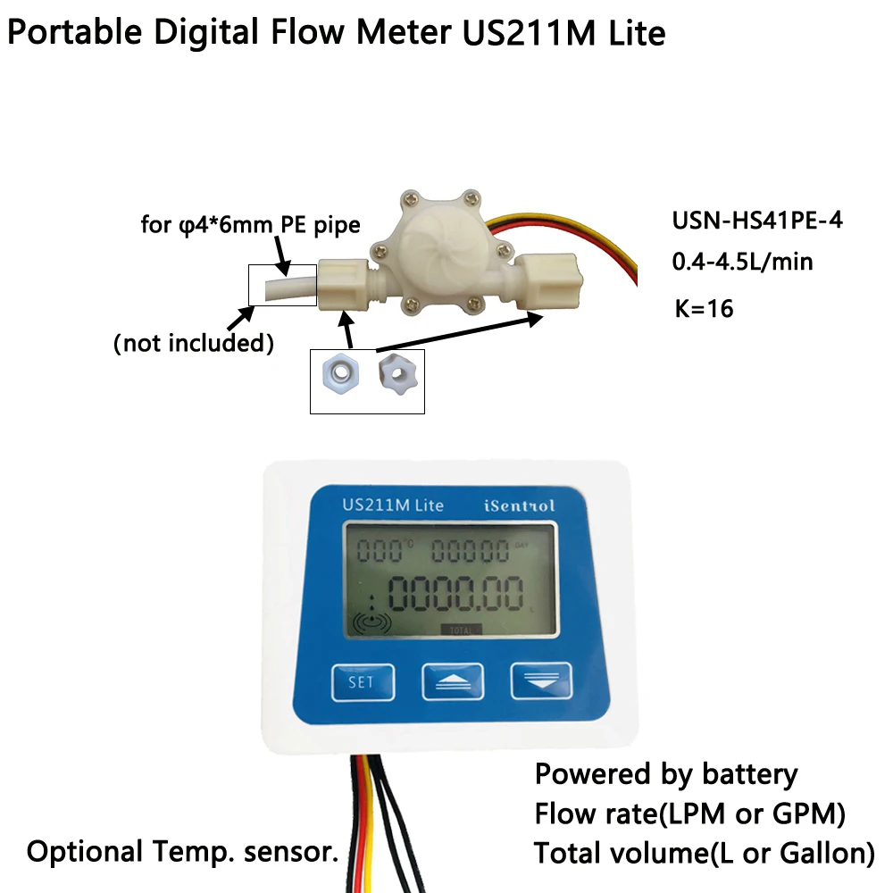 US211M Lite цифровой расходомер и USN-HS41PE-4 0,4-4.5LPM датчик общего объема и расхода