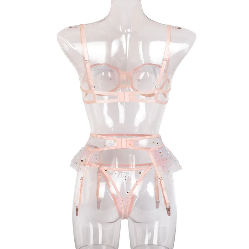 Сексуальный кружевной ажурный комплект из бюстгальтера и трусиков, костюм для девочек с яркими звездами, сетчатый комплект нижнего белья с подвязками с контрастными блестками, женские трусики с изображением сердца